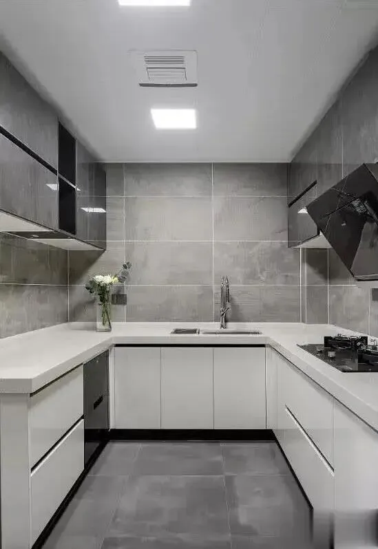 ▲这是把小卧室扩进来一部分形成的方正厨房,满足了U型布局,统一灰色调简洁素雅,白色地柜搭配亚克力深色吊柜,简洁舒适。