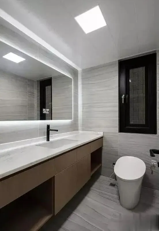▲主卫空间,缩小以后一部分给了主卧,没有做淋浴区,定制通墙浴柜,智能镜时尚搭配,马桶窗下布置,浴柜局部镂空兼顾纸盒子功能。