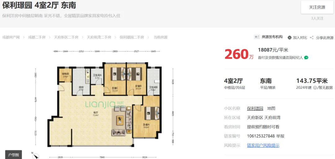 2026年02月06日,据市场端消息:成都天府新区万安,保利璟园建面144平套四报价260万;目前房东心里价在260万愿意出售。