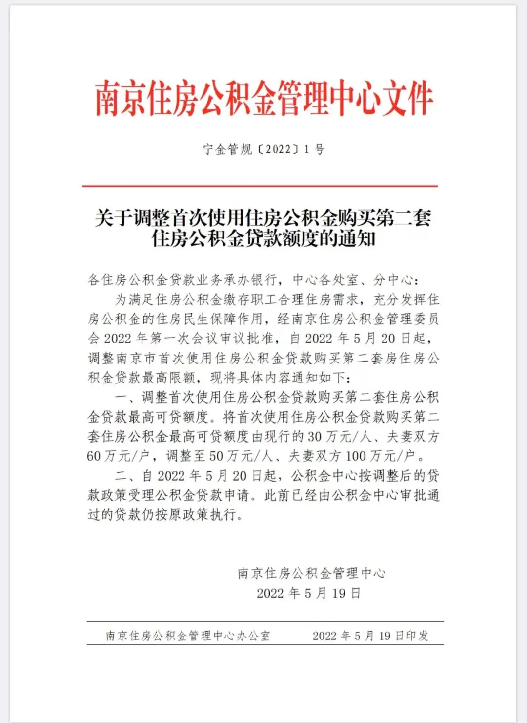 提升公积金贷款额度方面,按照南京住房公积金管理中心于5月19日发布的《关于调整首次使用住房公积金购买第二套住房公积金贷款额度的通知》,将首次使用住房公积金贷款购买第二套住房公积金最高可贷额度由现行的30万元/人、夫妻双方60万元/户,调整至50万元/人、夫妻双方100万元/户,切实减轻刚性改善群体购房负担。自2022年5月20日起,公积金中心按调整后的贷款政策受理公积金贷款申请。此前已经由公积金中心审批通过的贷款仍按原政策执行。