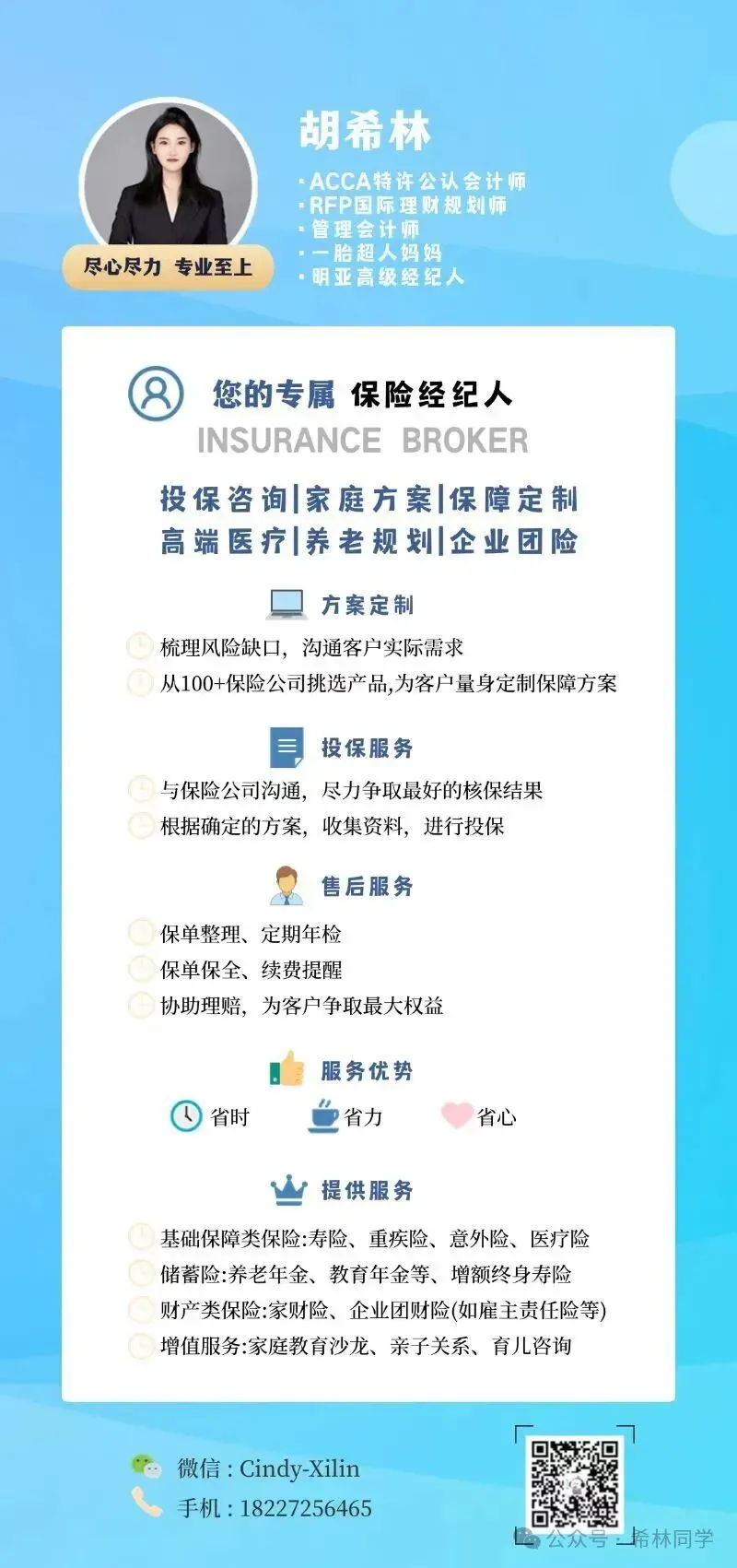 我是四川成都明亚保险经纪胡希林,ACCA国际注册会计师,IPO审计人,90后超人妈妈,左手带娃,右手搞钱,不做好后期服务绝不卖保险的保险经纪,始终坚持客观、中立、真诚、专业、利他。
