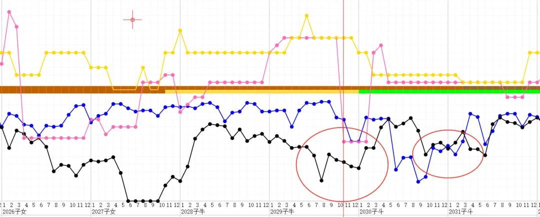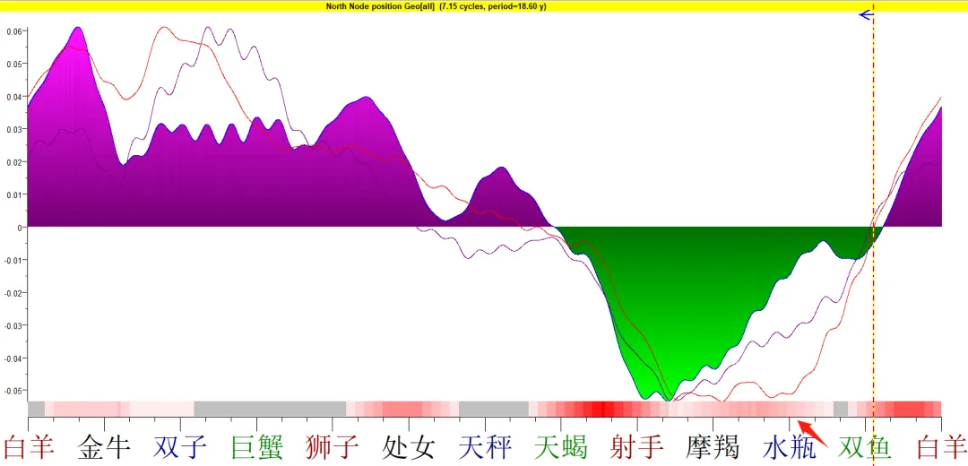 北交点当前位于双鱼座,已经进入下降趋势来到水平之下,之后的下降趋势逐步扩大。将在2026年7月进入水瓶座,2028年4月进入魔羯座,2029年10月进入射手座(这里是行星峰值的最低点)。由于北交点是逆行12宫的,所以上图的时间方向从右往左是过去到未来,上图中从进入绿色区域则为房价区域,下跌越多,对应的对房价越是不利。