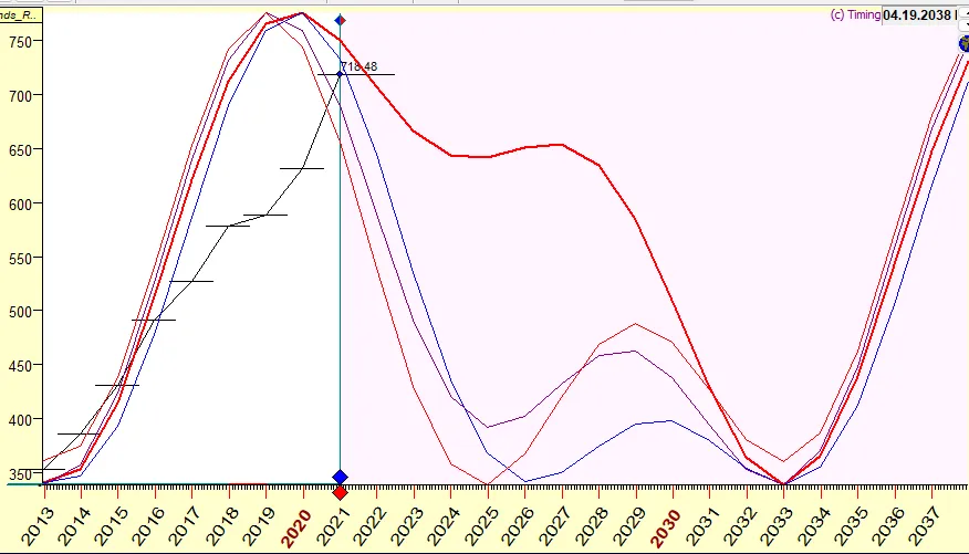 上图是2013年至2037年每一年的走势情况。数据线有多条不同颜色的线(红色、蓝色、黑色)分别是不同的小时间周期绘制的变化趋势。峰值出现在2020年至2021年期间(受疫情后美联储救市刺激)。