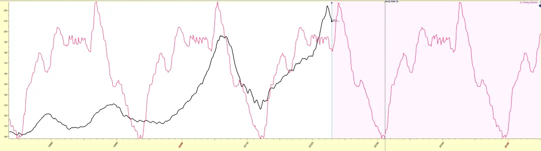 将18年周期与席勒房价指数拟合,并叠加北交点(计都星)18.6年运行周期,得到高度一致的时间结构。