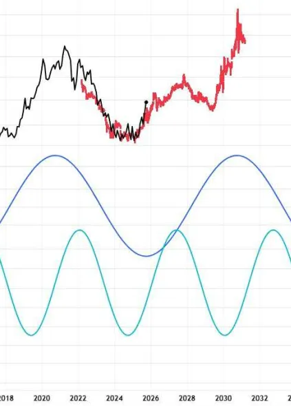 结合《江恩黄金循环星体共振分析》,上图红色曲线,黄金价格峰值同样指向了2031年前后。