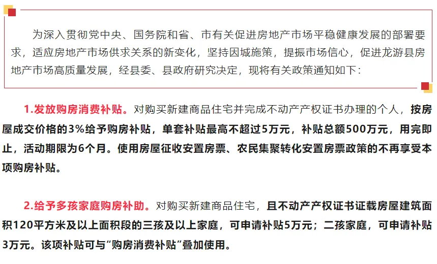 1.发放购房消费补贴。对购买新建商品住宅并完成不动产产权证书办理的个人,按房屋成交价格的3%给予购房补贴,单套补贴最高不超过5万元,补贴总额500万元,用完即止,活动期限为6个月。使用房屋征收安置房票、农民集聚转化安置房票政策的不再享受本项购房补贴。