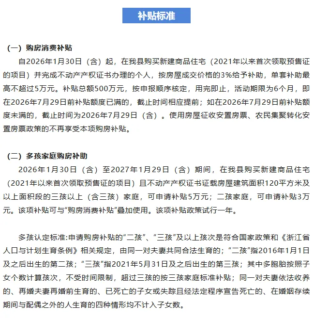 2.给予多孩家庭购房补助。对购买新建商品住宅,且不动产产权证书证载房屋建筑面积120平方米及以上面积段的三孩及以上家庭,可申请补贴5万元;二孩家庭,可申请补贴3万元。该项补贴可与“购房消费补贴”叠加使用。