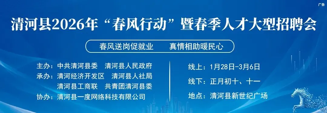 点击上方蓝字关注我们,招聘求职、房屋信息、二手交易、电话查询尽在清河一度信息港