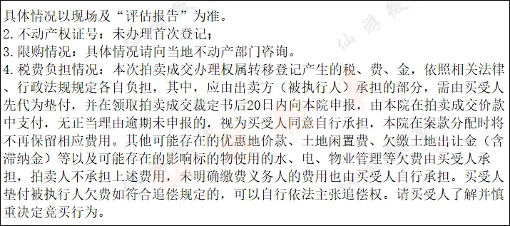 三、标的物以实物现状为准,法院不承担拍卖标的物瑕疵保证。竞买人决定参与竞买的,视为对拍卖财产完全了解,并接受拍卖财产一切已知和未知瑕疵。法院不安排统一看样,有意向竞买者务必在参与竞拍前自行前往房地产坐落处了解情况。