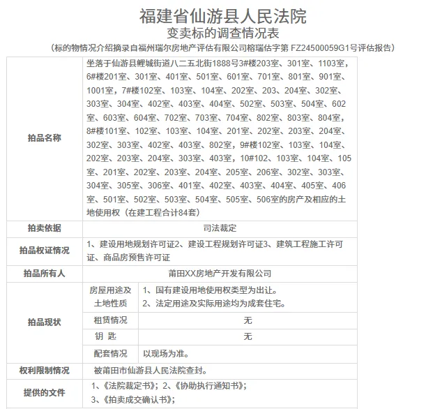 一、拍卖标的物:坐落于仙游县鲤城街道八二五北街1888号3#楼203室、301室、1103室,6#楼201室、301室、401室、501室、601室、701室、801室、901室、1001室,7#楼102室、103室、104室、202室、203、204室、302室、303室、304室、402室、403室、404室、502室、503室、504室、602室、603室、604室、702室、703室、704室、802室、803室、804室,8#楼101室、102室、103室、104室、201室、202室、203室、204室、302室、303室、402室、403室、802室,9#楼102室、103室、104室、202室、203室、204室、303室、403室,10#102、103室、104室、105室、201室、202室、203室、204室、205室、206室、302室、303室、304室、305室、306室、401室、402室、403室、404室、405室、406室、501室、502室、503室、504室、505室、506室的房产及相应的土地使用权(在建工程,合计84套):