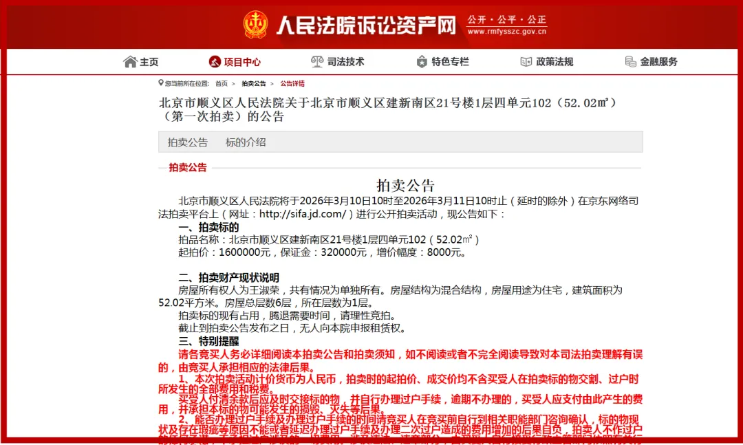 北京青年报记者昨日获悉,阿里资产·司法网发布公告,建新南区等5处房产陆续公开拍卖。这5处房产均采取设有保留价的增价拍卖方式,起拍价最低为0.65万元/平方米,最高为3.08万元/平方米。除部分人员外,凡具备完全民事行为能力的公民、法人和其他组织均可参加。