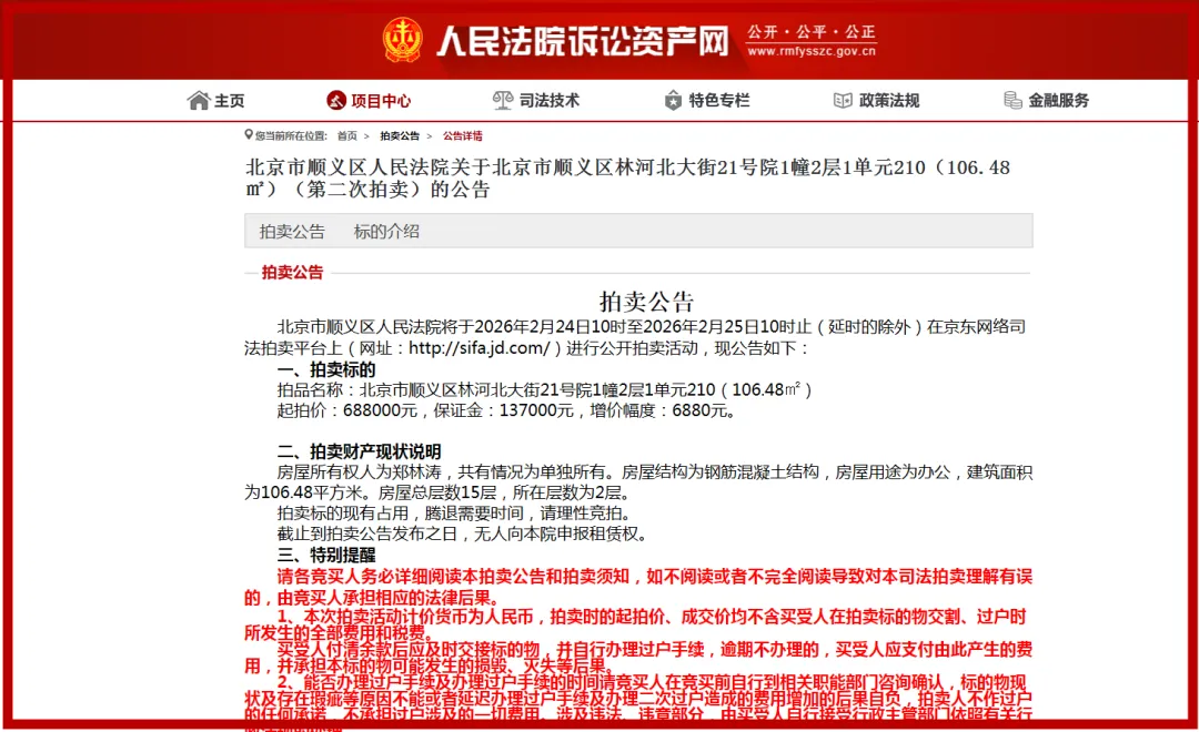 拍卖竞价前,系统将冻结竞拍人账户内部分资金作为应缴的保证金,冻结期间不计利息。拍卖结束后,未竞得者的保证金自动解冻,而竞得者的保证金将自动转入北京市顺义区人民法院指定账户,并于规定日期内将余款缴入法院指定账户。逾期未支付的,将自行承担相应法律责任。竞拍成功后,买收人(法定代表人、其他组织的负责人)须与委托代理人一同到法院办理交接手续。