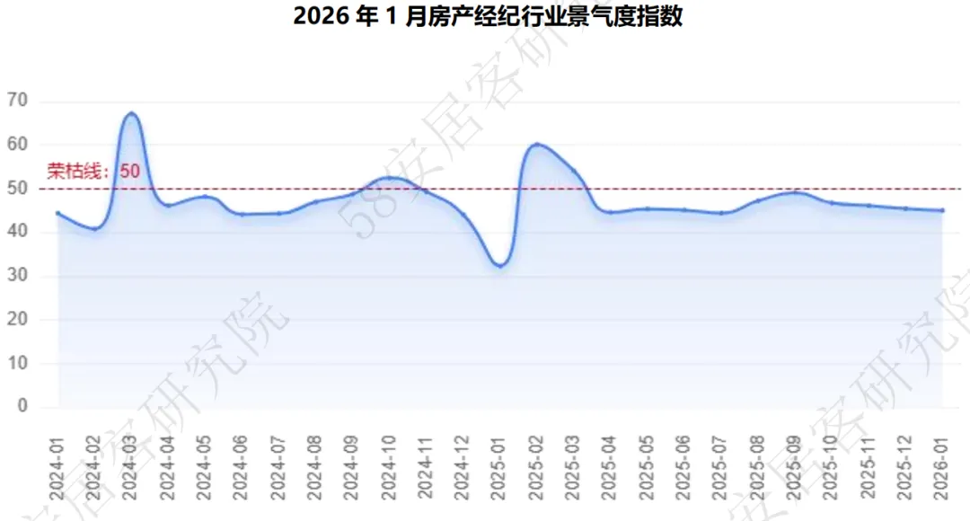 2026年1月,房产经纪行业景气度虽处下行区间,但表现出“环比微降、同比大幅回升”的特点。当月行业景气度指数为45.03,按荣枯判断标准,低于50荣枯线,行业仍在下行。不过,对比历史数据,行业筑底修复态势未变,整体表现符合春节前传统市场规律。