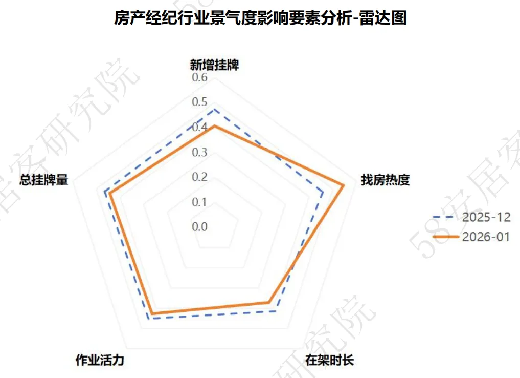 2026年1月房产经纪景气度指数环比微降0.4个百分点,仅为春节前作业活力、新增挂牌(理性收缩)等分项的季节性小幅调整,而找房热度回升、在架时长缩短、总挂牌量下降等核心信号,已明确体现市场回暖态势,季节性扰动并未改变行业筑底修复的大方向。本月指数较去年同期大幅回升,核心原因是2025年全年行业处于筑底修复通道,叠加房地产支持政策持续发力,使得2026年市场基础优于2025年同期,五大分项指数同比全面改善。