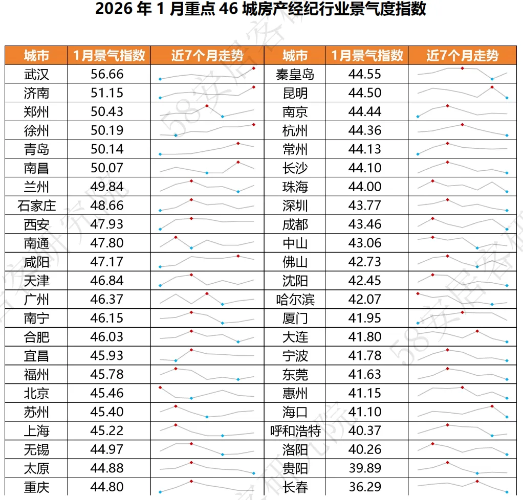 2026年1月,8成以上城市经纪行业景气度低于50荣枯线。在监测的46个城市中,有6城(占比约13%)的景气度指数高于荣枯线50,较上月增加2个。城市之间分化明显,太原、昆明、长春等15城景气度指数达近7个月以来的最低点,而武汉、济南、徐州景气度持续“回升”并在本月迎来高点。青岛和南昌连续两个月景气度在50以上。按城市能级划分,一线城市景气度指数全部低于50,平均约45.2,较上月降低0.6;新一线城市约46.2,较上月上升0.7,其中武汉、郑州、青岛高于50;二线城市平均为44.7,较上月降低0.5,其中济南、徐州、南昌突破50荣枯线;三四线城市景气度指数全部低于50。
