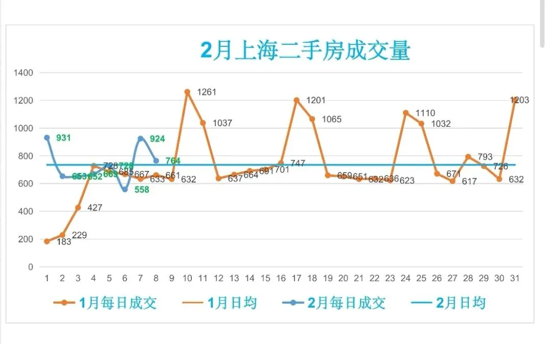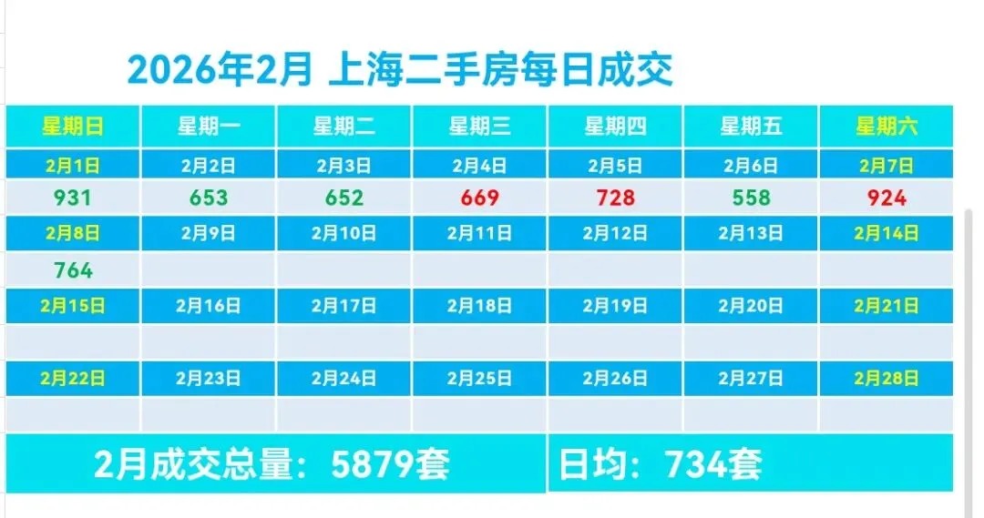 🏡2月,上海二手房成交量累计5879套,日均成交734套,较上个月日均减少2套(降幅0.27%)。