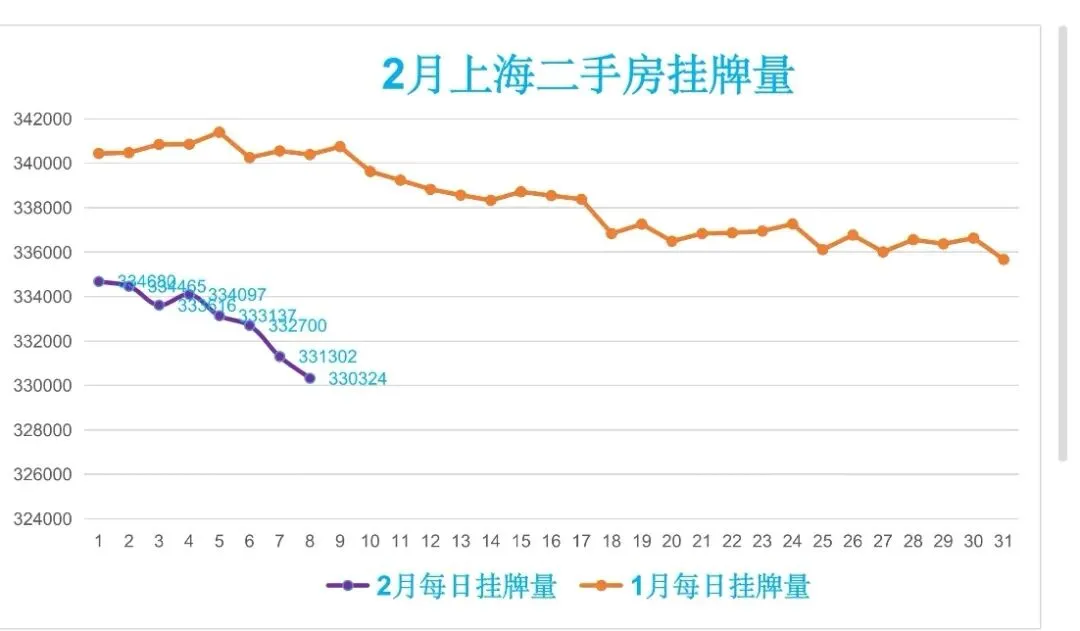 🏠昨日(2月8日,周日)挂牌330324笔,较前一日减少978笔,日均挂牌333040笔,约33.3万笔,挂牌与实际成交比453:1,去化周期约15.1个月。