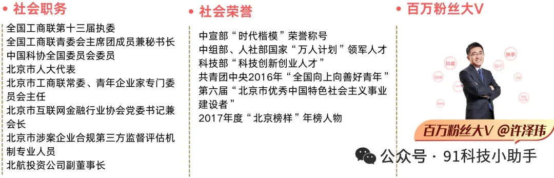 91科技集团成立于2011年,集团总部位于北京,在上海、天津、重庆、深圳、厦门、武汉、西安、南京、苏州等地设有分支机构。集团创始人、董事长许泽玮:毕业于北京航空航天大学,正高级经济师,任全国工商联执委、中国科协全国委员会委员、北京市人大代表、北京市工商联常委、北京市延庆区工商联主席。91科技集团将科技创新和产业创新深度融合,目前已形成金融服务、媒体+文化服务、科创服务、司法服务四大业务板块的综合性科技企业。91金融小助手是91科技集团金融业务宣传平台,专业提供贷款产品申请、专属贷款方案定制、贷款信息工具、1对1咨询等服务,通过聚集优质项目,助力中小企业与金融市场对接,缓解中小企业贷款难问题。想了解更多产品信息,欢迎拨打:400-000-6191进行咨询,微信电话同步:13071130091,或搜索小程序“91金融小助手”在线沟通。