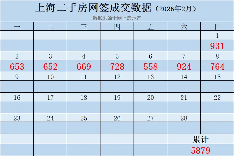 2026年2月上海二手房成交统计:(数据来源网上房地产)