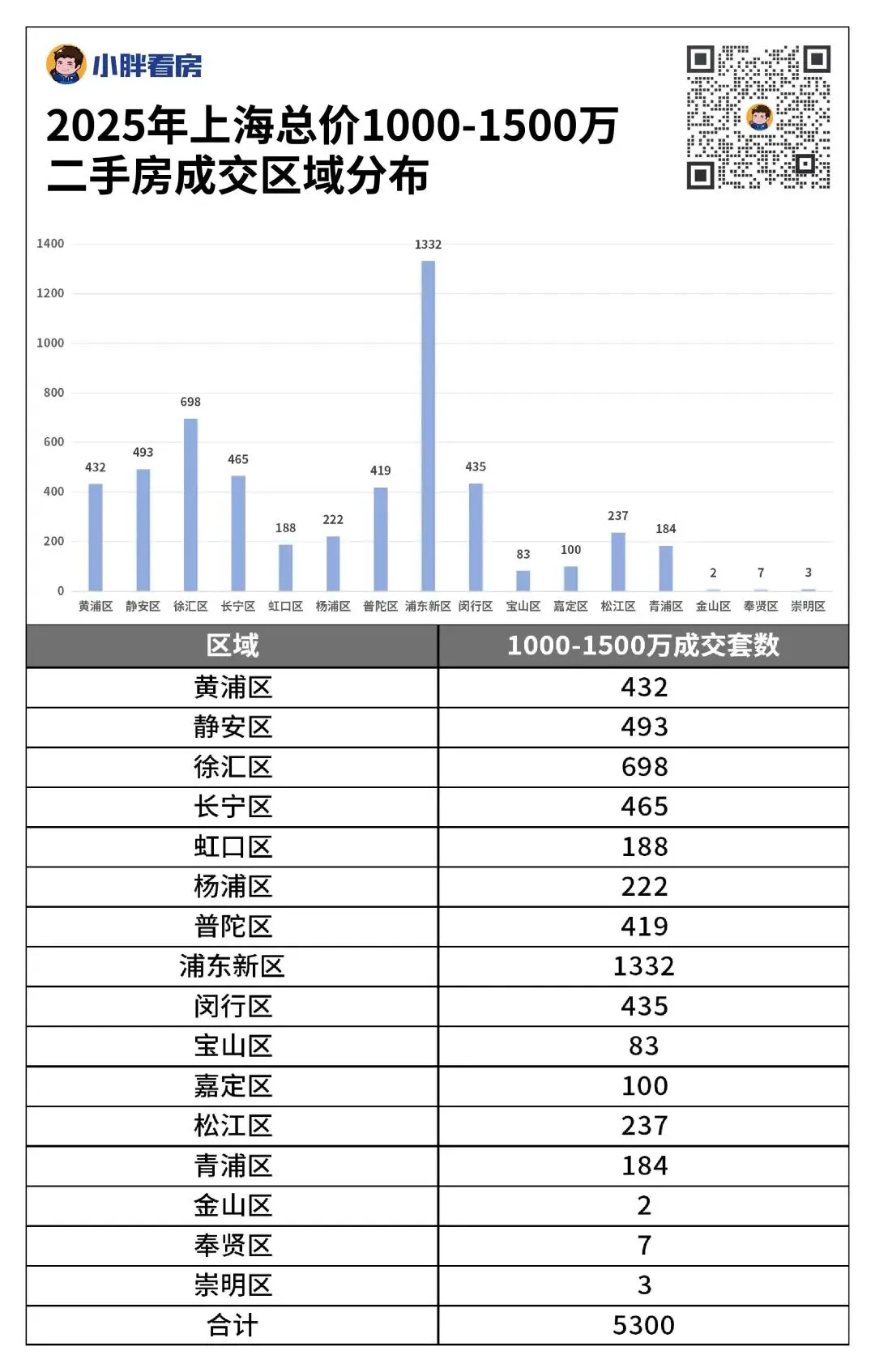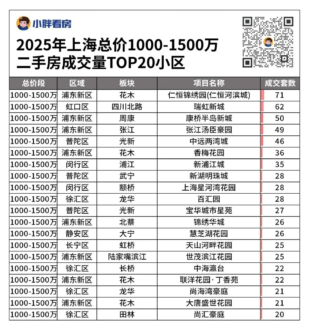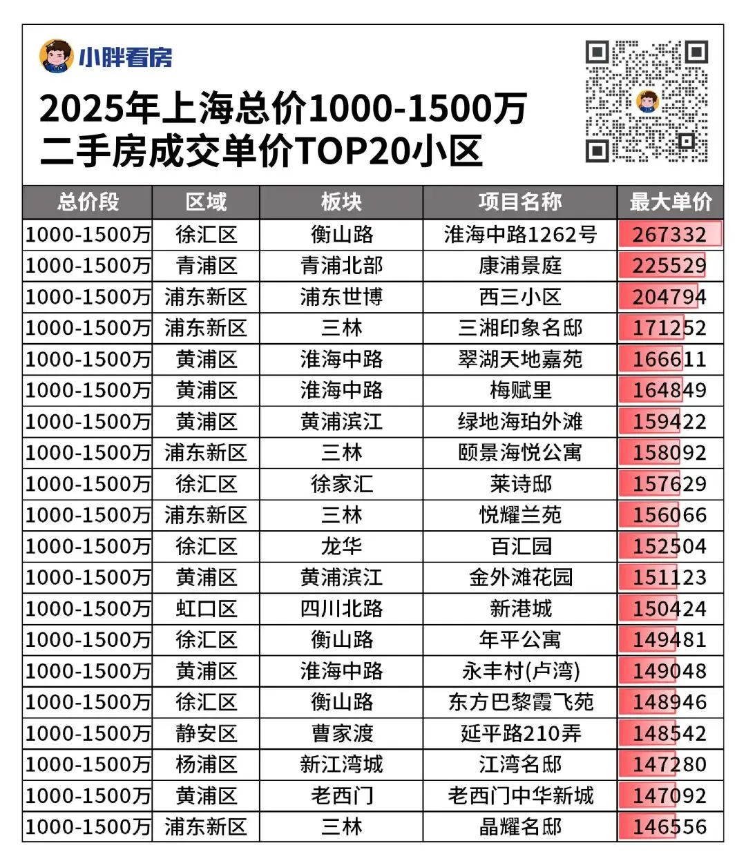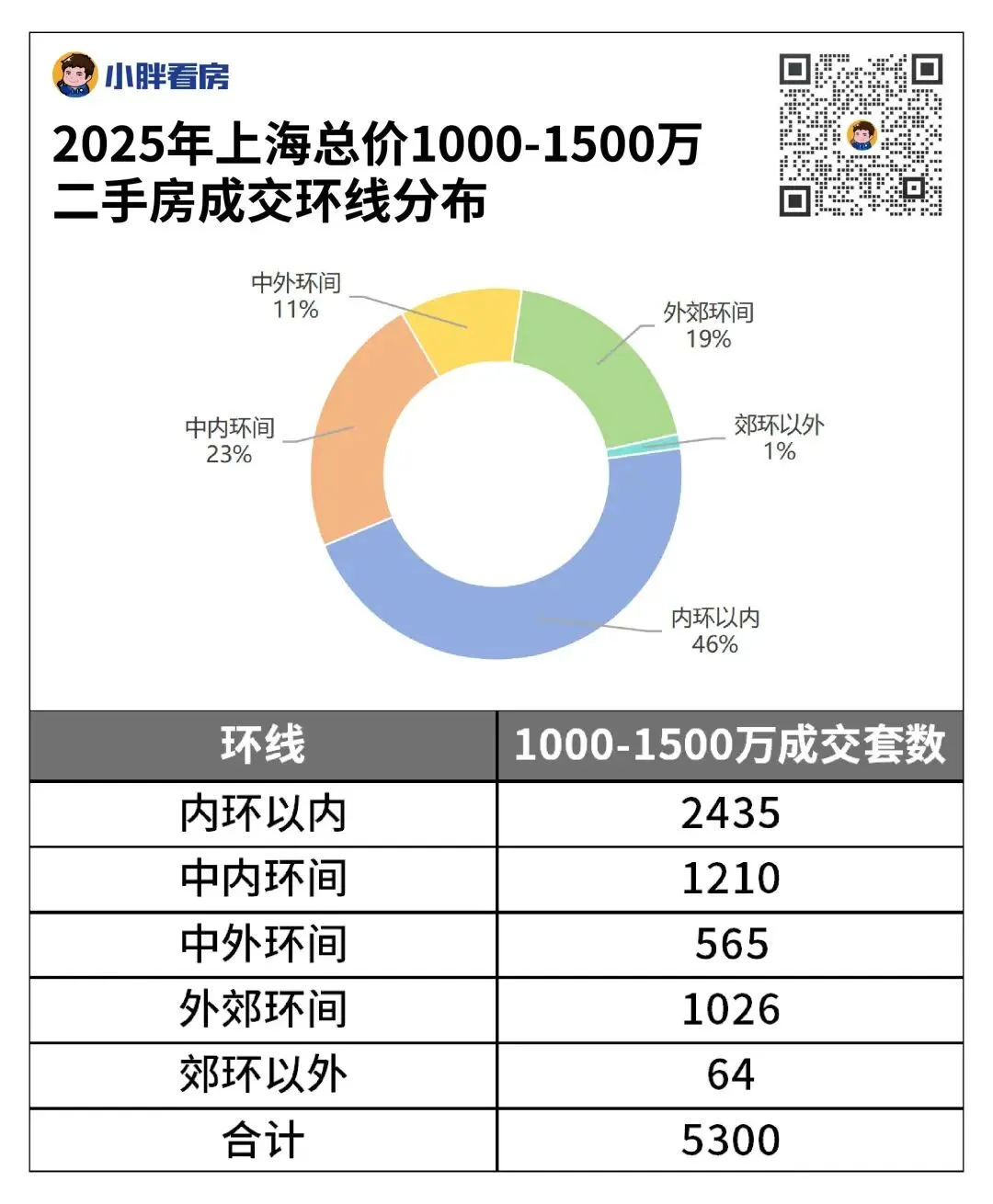 那么问题来了,对于高端改善的客户来说,到底是地段更重要还是品质更重要?那些最受欢迎的高端改善房子都在哪里?都被谁买走了呢?今天小胖君就为大家带来总价1000-1500万高端改善二手市场的年度总结!以下是去年所有二手房的月度成交走势和总价1000-1500万月度成交走势,大家可以对比下总价1000-1500万高端改善住宅虽然占比小,但趋势几乎和整体保持一致作为置换金字塔的塔尖产品,对整个市场走势有引领作用!我们把去年成交的5300套高端改善住宅按环线细分,不难发现:· 内环内是高端改善买家的首选,占比高达约46%;· 浦东一枝独秀,成交了1332套,占比超过四分之一!· 主力成交面积集中在140-200㎡,核心地段的3-4房是高端改善买家的最爱!· 110㎡以下成交就很少了,合计占比仅约11%;最后聚焦到小区,来看去年总价1000-1500万高端改善成交最多的小区都是谁?排名第一的是浦东花木的仁恒河滨城,成交71套,遥遥领先排名第二的来自虹口四川北路的瑞虹新城,小区体量大地段好,合计成交62套!先看整体走势,在2020年高端改善住宅的成交均价不过6.9万/㎡左右2022年均价飙升至7.66万+,2025年下降到7.48万/㎡左右!我们把去年总价1000-1500万高端改善住宅的成交按环线划分:· 中外环成交均价直线下滑,只要约7.12万/㎡;· 而到了外环外成交均价只有约4.3-5.5万/㎡;· 黄浦高端改善住宅的成交均价高达约9.04万/㎡;· 徐汇、虹口组成第三梯队,均价8.6-8.7万/m²;最后我们来看,去年单价最贵的高端改善住宅都来自哪些小区?排名第1是徐汇衡山路的淮海中路1262号,成交单价约26.7万/㎡!排名2名是青浦的康浦景庭,成交单价22.6万/㎡。排名第3的是浦东世博的西三小区,单价超过20.5万/㎡!据链家网2026年1月25日数据显示,总挂牌房源83202套,其中挂牌总价1000-1500万的房源有5533套,占比总池子约6.65%!目前链家网挂牌总价1000-1500万房源房龄集中在20-30年,也就是九几年到零几年为主!10年内的次新房占比约17.39%,30年以上的老小区很少来看价格,与去年1月1日进行匹配,其中有1107套挂牌房源匹配成功,其中:最后来看,近1年来,1000-1500万房源中降幅最大的都是谁?降幅最大的是青浦赵巷金地佘山天境的一套房源,让利600万!关于更多上海楼市的信息,或者您想和其他购房小伙伴一起咨询讨论,欢迎扫描下方二维码,添加小胖君,加入小胖看房@专属微信群~(备注:150000名小胖看房团群友数量来自1月各微信群人数总和)