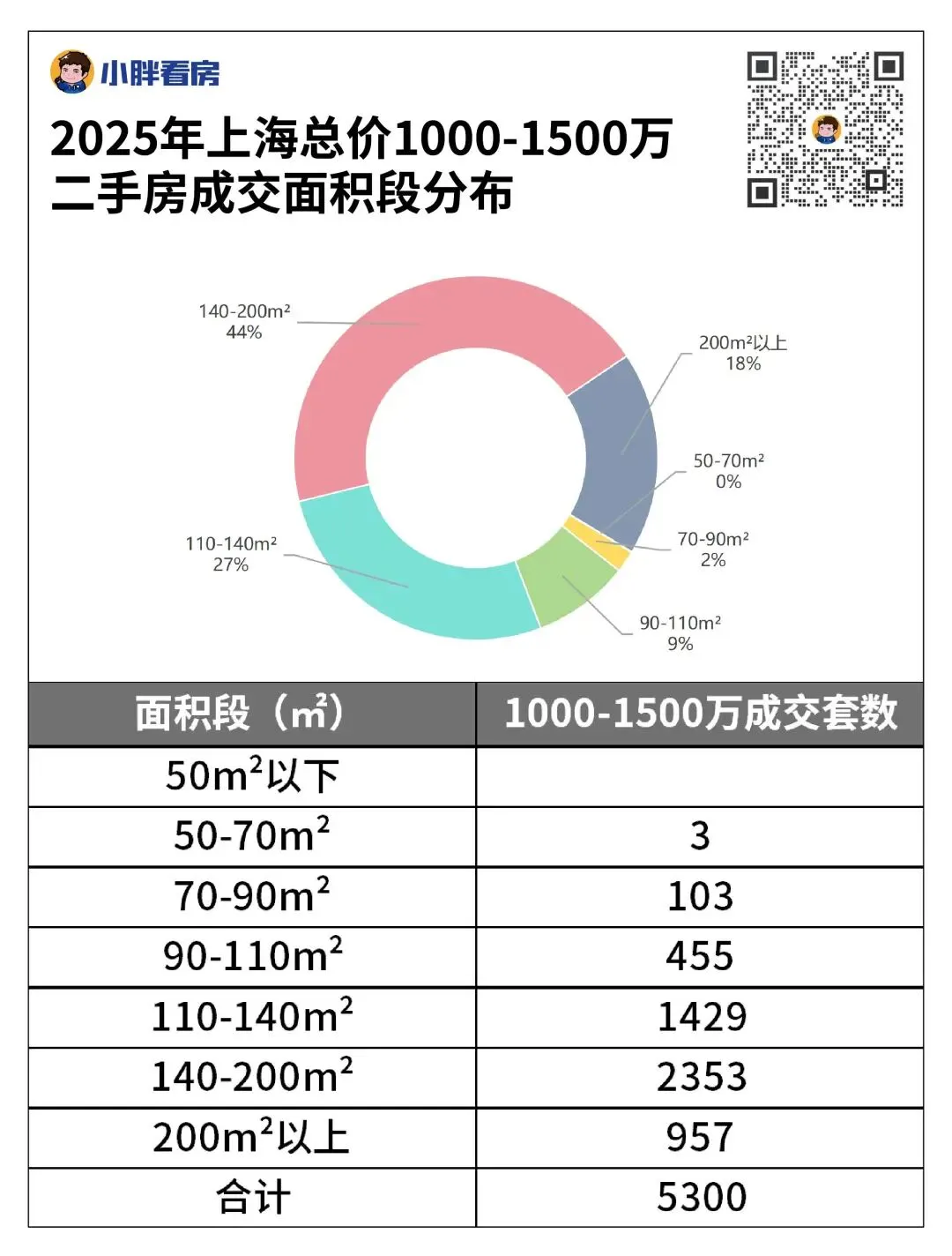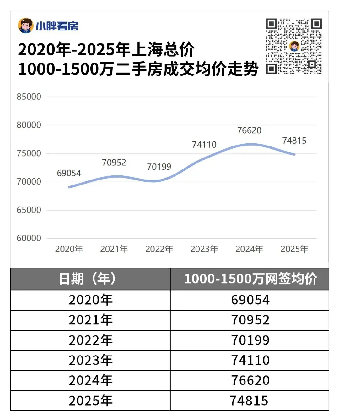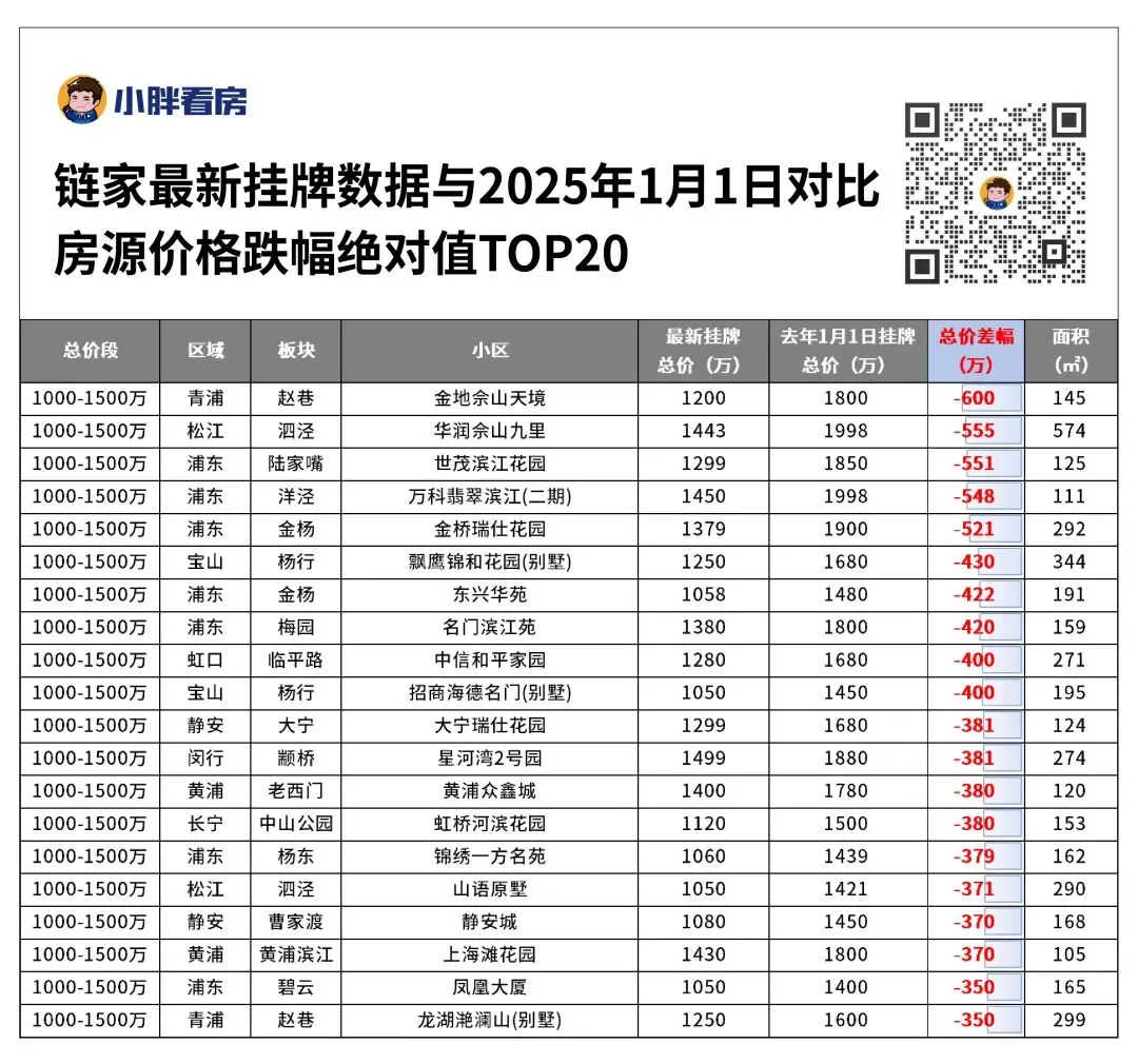 那么问题来了,对于高端改善的客户来说,到底是地段更重要还是品质更重要?那些最受欢迎的高端改善房子都在哪里?都被谁买走了呢?今天小胖君就为大家带来总价1000-1500万高端改善二手市场的年度总结!以下是去年所有二手房的月度成交走势和总价1000-1500万月度成交走势,大家可以对比下总价1000-1500万高端改善住宅虽然占比小,但趋势几乎和整体保持一致作为置换金字塔的塔尖产品,对整个市场走势有引领作用!我们把去年成交的5300套高端改善住宅按环线细分,不难发现:· 内环内是高端改善买家的首选,占比高达约46%;· 浦东一枝独秀,成交了1332套,占比超过四分之一!· 主力成交面积集中在140-200㎡,核心地段的3-4房是高端改善买家的最爱!· 110㎡以下成交就很少了,合计占比仅约11%;最后聚焦到小区,来看去年总价1000-1500万高端改善成交最多的小区都是谁?排名第一的是浦东花木的仁恒河滨城,成交71套,遥遥领先排名第二的来自虹口四川北路的瑞虹新城,小区体量大地段好,合计成交62套!先看整体走势,在2020年高端改善住宅的成交均价不过6.9万/㎡左右2022年均价飙升至7.66万+,2025年下降到7.48万/㎡左右!我们把去年总价1000-1500万高端改善住宅的成交按环线划分:· 中外环成交均价直线下滑,只要约7.12万/㎡;· 而到了外环外成交均价只有约4.3-5.5万/㎡;· 黄浦高端改善住宅的成交均价高达约9.04万/㎡;· 徐汇、虹口组成第三梯队,均价8.6-8.7万/m²;最后我们来看,去年单价最贵的高端改善住宅都来自哪些小区?排名第1是徐汇衡山路的淮海中路1262号,成交单价约26.7万/㎡!排名2名是青浦的康浦景庭,成交单价22.6万/㎡。排名第3的是浦东世博的西三小区,单价超过20.5万/㎡!据链家网2026年1月25日数据显示,总挂牌房源83202套,其中挂牌总价1000-1500万的房源有5533套,占比总池子约6.65%!目前链家网挂牌总价1000-1500万房源房龄集中在20-30年,也就是九几年到零几年为主!10年内的次新房占比约17.39%,30年以上的老小区很少来看价格,与去年1月1日进行匹配,其中有1107套挂牌房源匹配成功,其中:最后来看,近1年来,1000-1500万房源中降幅最大的都是谁?降幅最大的是青浦赵巷金地佘山天境的一套房源,让利600万!关于更多上海楼市的信息,或者您想和其他购房小伙伴一起咨询讨论,欢迎扫描下方二维码,添加小胖君,加入小胖看房@专属微信群~(备注:150000名小胖看房团群友数量来自1月各微信群人数总和)