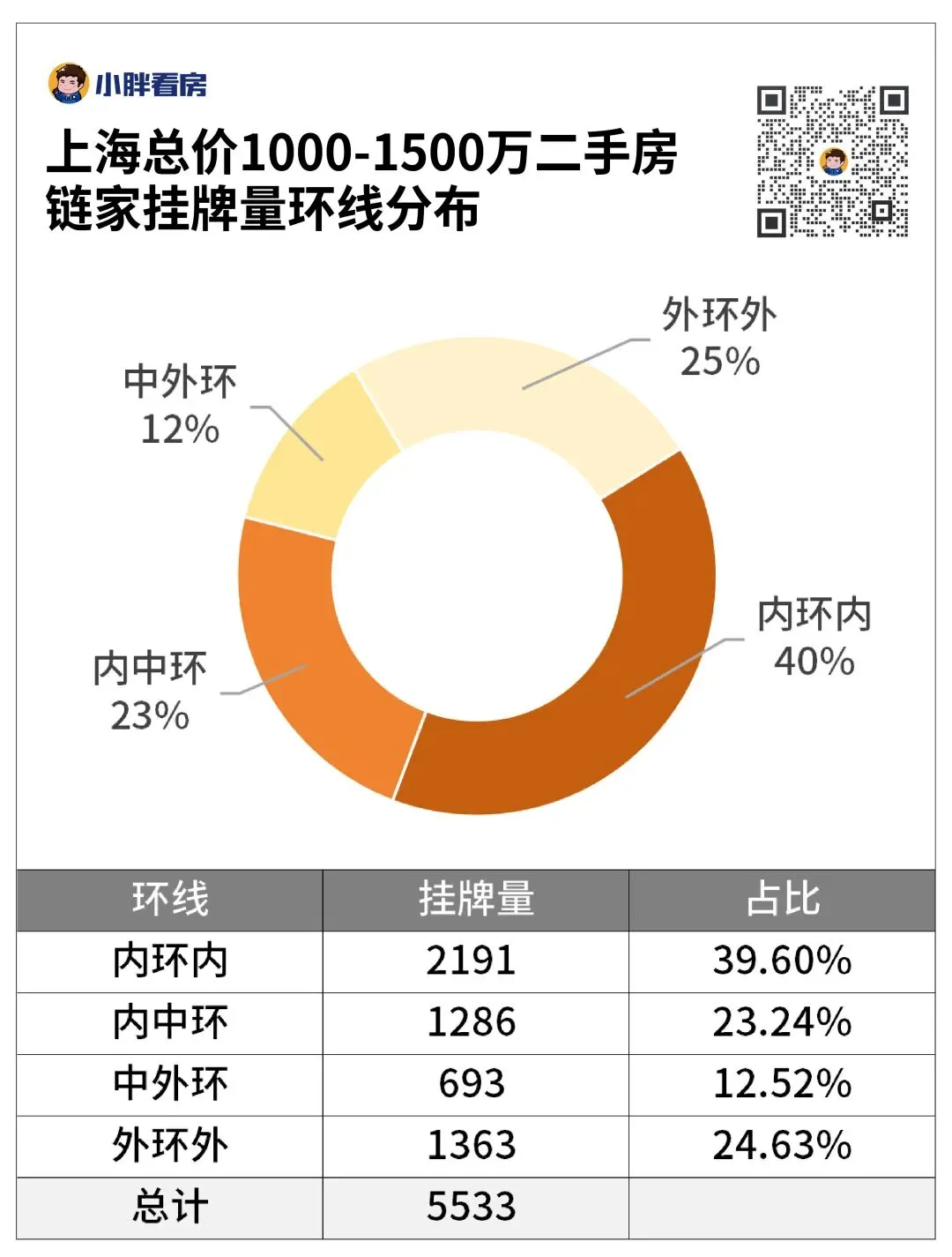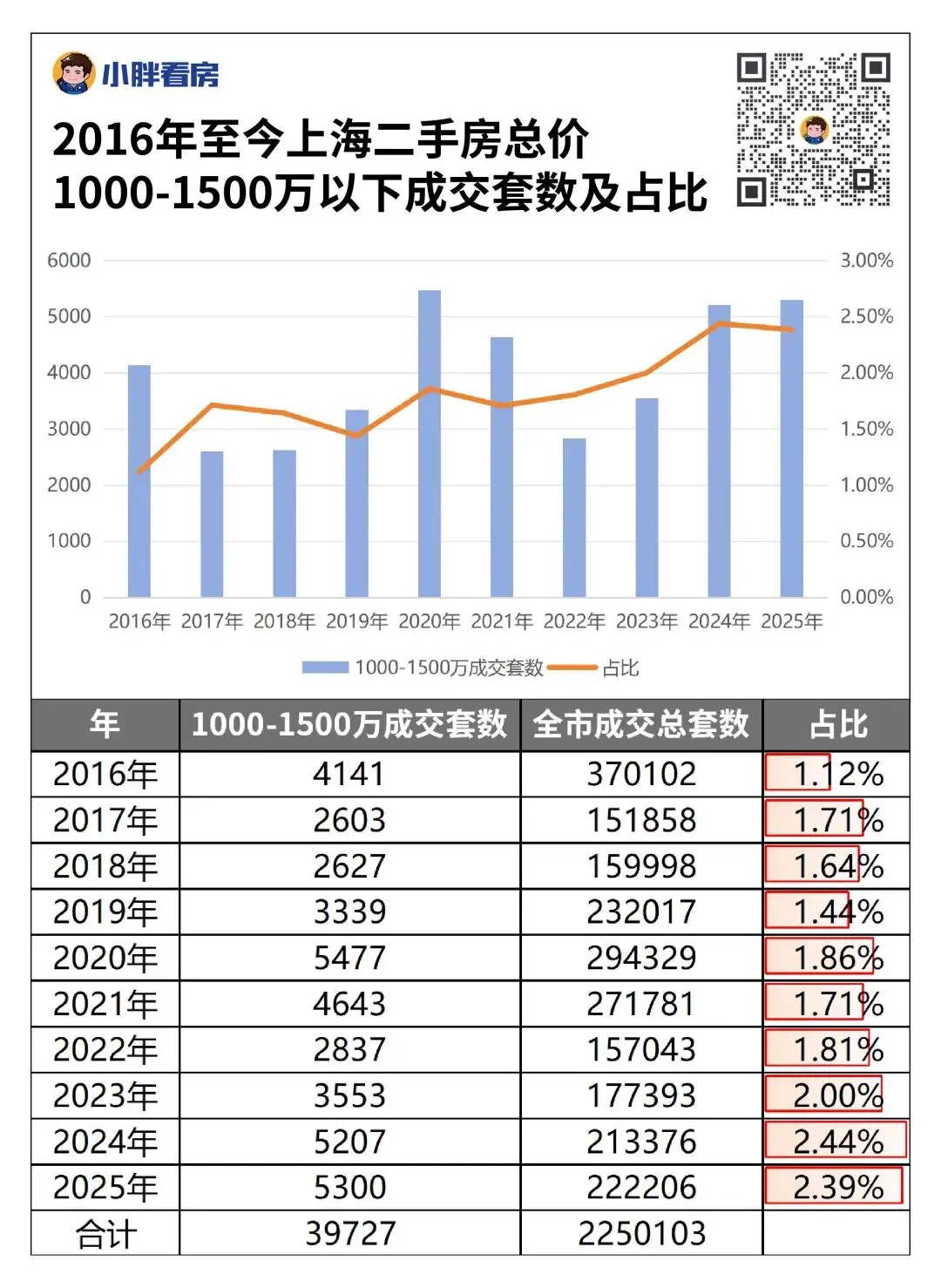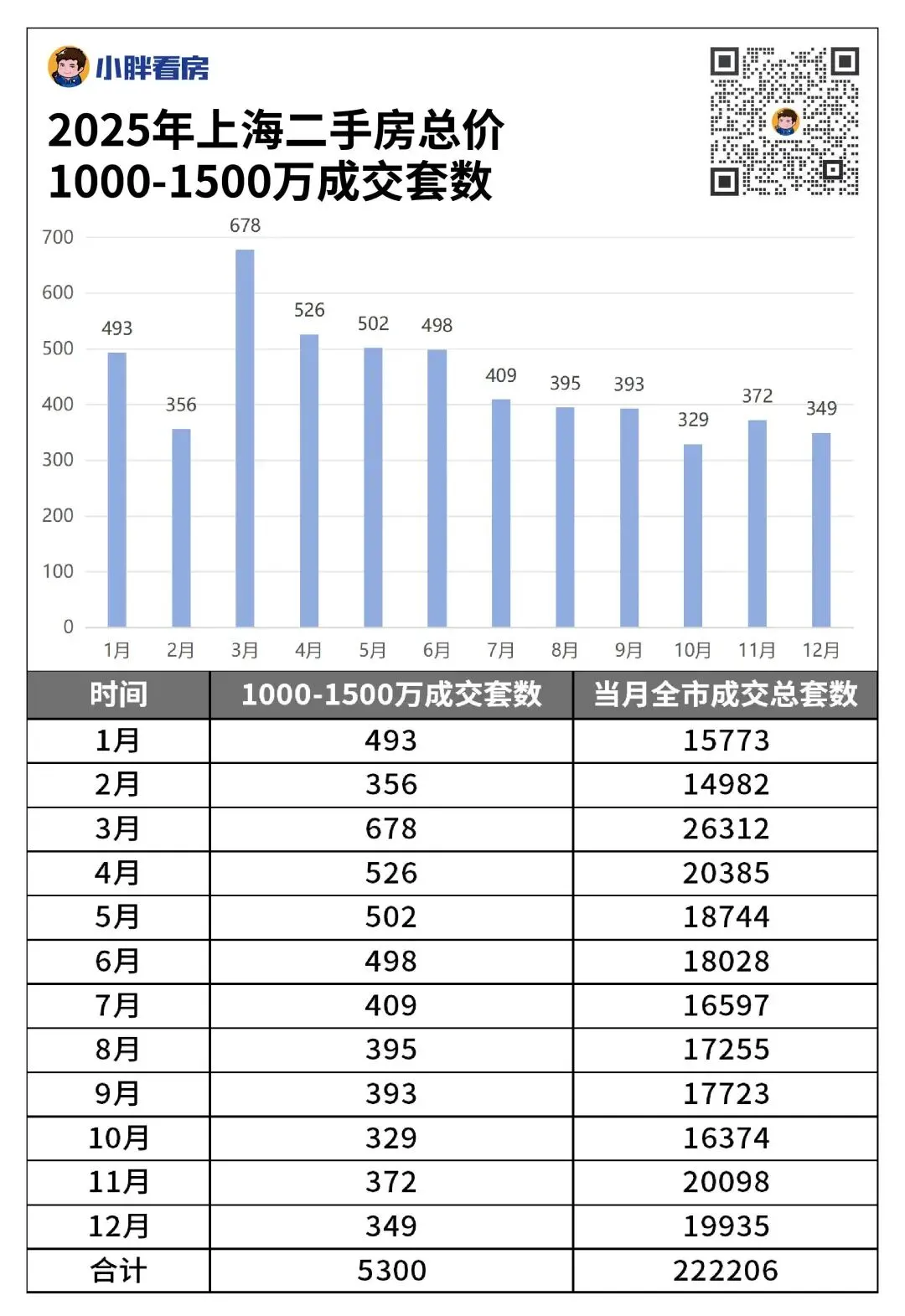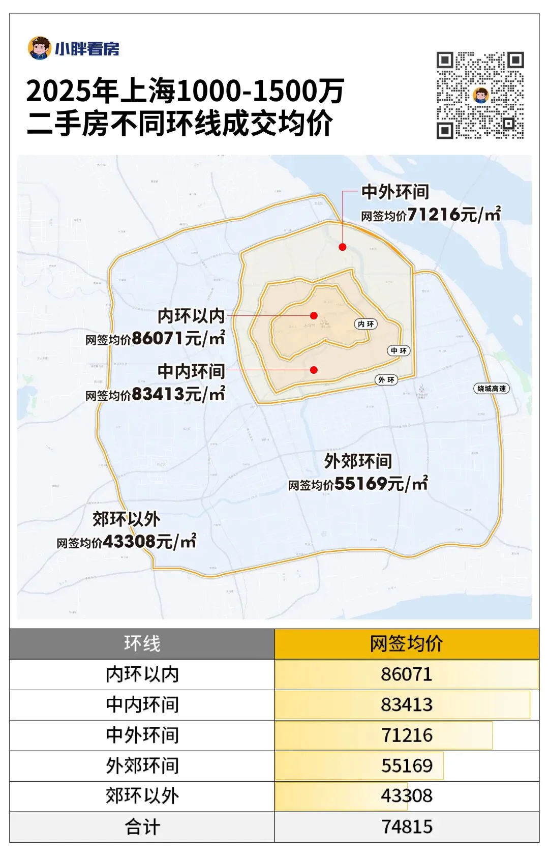 那么问题来了,对于高端改善的客户来说,到底是地段更重要还是品质更重要?那些最受欢迎的高端改善房子都在哪里?都被谁买走了呢?今天小胖君就为大家带来总价1000-1500万高端改善二手市场的年度总结!以下是去年所有二手房的月度成交走势和总价1000-1500万月度成交走势,大家可以对比下总价1000-1500万高端改善住宅虽然占比小,但趋势几乎和整体保持一致作为置换金字塔的塔尖产品,对整个市场走势有引领作用!我们把去年成交的5300套高端改善住宅按环线细分,不难发现:· 内环内是高端改善买家的首选,占比高达约46%;· 浦东一枝独秀,成交了1332套,占比超过四分之一!· 主力成交面积集中在140-200㎡,核心地段的3-4房是高端改善买家的最爱!· 110㎡以下成交就很少了,合计占比仅约11%;最后聚焦到小区,来看去年总价1000-1500万高端改善成交最多的小区都是谁?排名第一的是浦东花木的仁恒河滨城,成交71套,遥遥领先排名第二的来自虹口四川北路的瑞虹新城,小区体量大地段好,合计成交62套!先看整体走势,在2020年高端改善住宅的成交均价不过6.9万/㎡左右2022年均价飙升至7.66万+,2025年下降到7.48万/㎡左右!我们把去年总价1000-1500万高端改善住宅的成交按环线划分:· 中外环成交均价直线下滑,只要约7.12万/㎡;· 而到了外环外成交均价只有约4.3-5.5万/㎡;· 黄浦高端改善住宅的成交均价高达约9.04万/㎡;· 徐汇、虹口组成第三梯队,均价8.6-8.7万/m²;最后我们来看,去年单价最贵的高端改善住宅都来自哪些小区?排名第1是徐汇衡山路的淮海中路1262号,成交单价约26.7万/㎡!排名2名是青浦的康浦景庭,成交单价22.6万/㎡。排名第3的是浦东世博的西三小区,单价超过20.5万/㎡!据链家网2026年1月25日数据显示,总挂牌房源83202套,其中挂牌总价1000-1500万的房源有5533套,占比总池子约6.65%!目前链家网挂牌总价1000-1500万房源房龄集中在20-30年,也就是九几年到零几年为主!10年内的次新房占比约17.39%,30年以上的老小区很少来看价格,与去年1月1日进行匹配,其中有1107套挂牌房源匹配成功,其中:最后来看,近1年来,1000-1500万房源中降幅最大的都是谁?降幅最大的是青浦赵巷金地佘山天境的一套房源,让利600万!关于更多上海楼市的信息,或者您想和其他购房小伙伴一起咨询讨论,欢迎扫描下方二维码,添加小胖君,加入小胖看房@专属微信群~(备注:150000名小胖看房团群友数量来自1月各微信群人数总和)