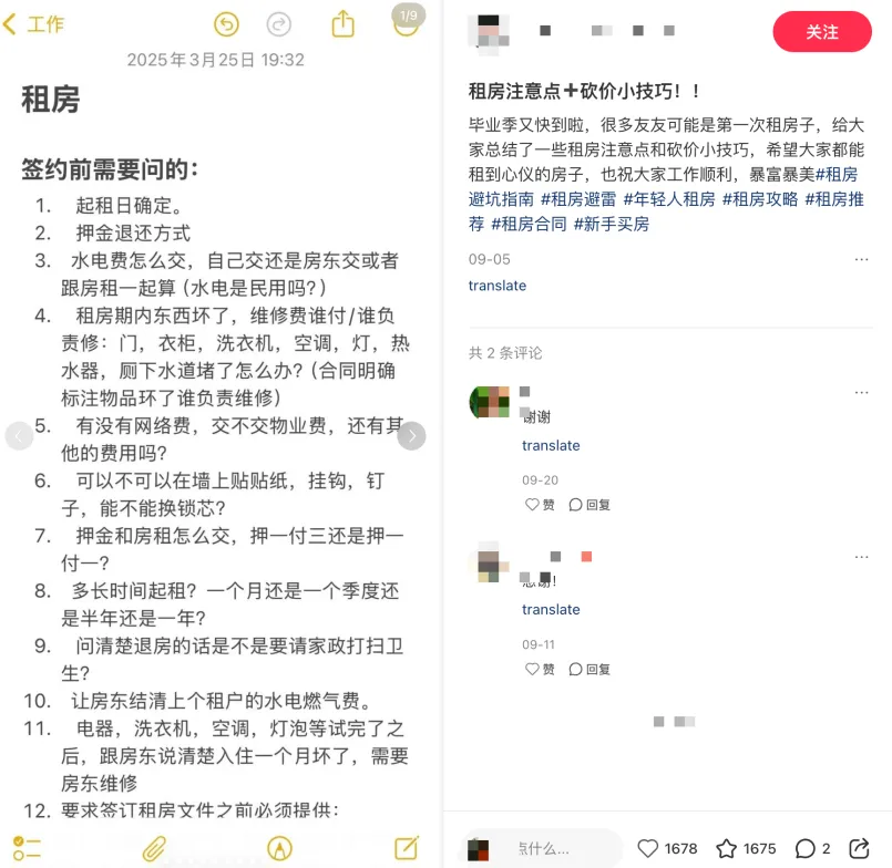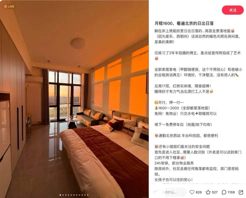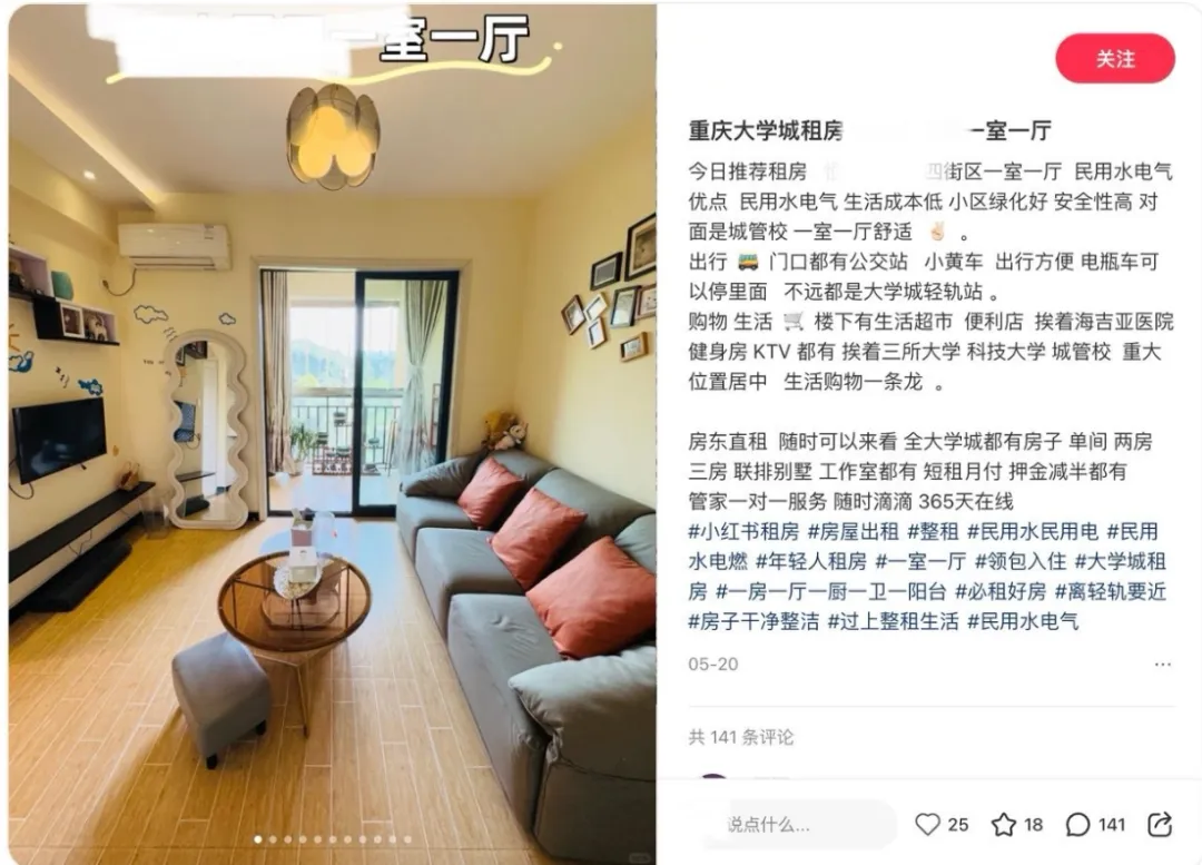 3.案例图片亮点:创意直观,强化信息传递,封面中用“已租”“未租”对房源状态进行标注,打破传统租房图文分离、信息传递模糊的模式。租客无需点开详情逐一看房,通过图片就能快速筛选出可租房间,降低信息获取成本,这种直观且有创意的呈现方式,契合短视频/社交平台用户“快速浏览、高效获取”的习惯,增加内容传播性与实用性 。 图片展示房屋实际外观、阳台晾晒衣物、空调配置等生活场景。