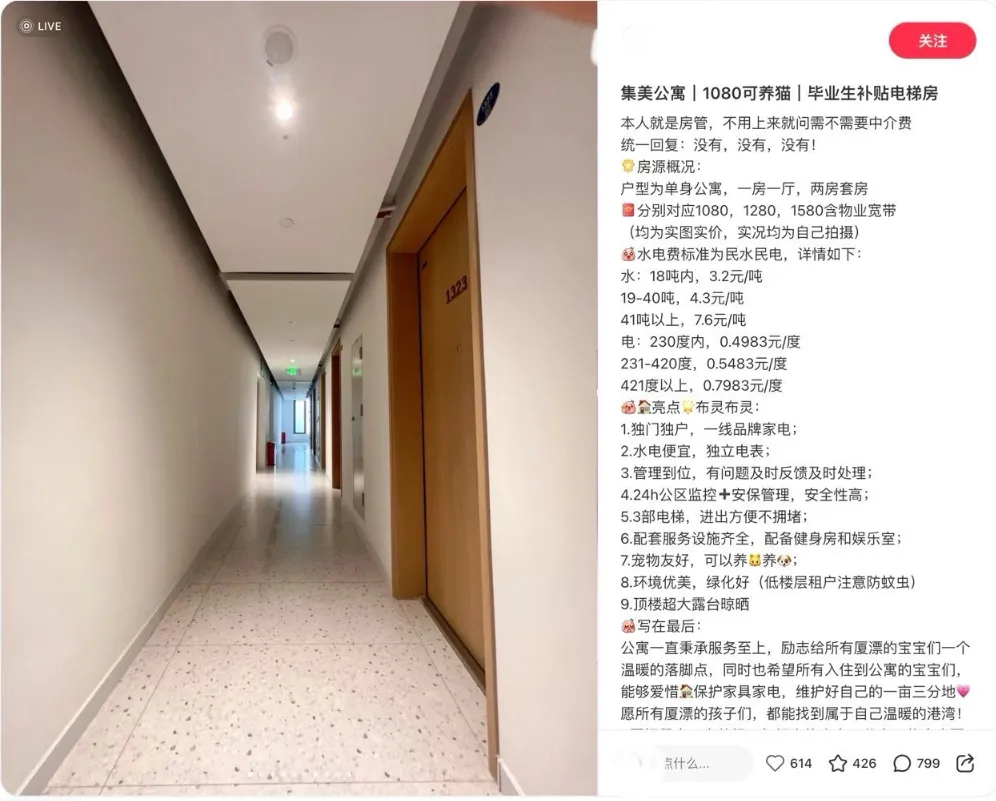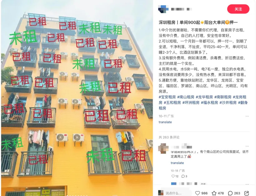 2.内容亮点:真诚务实,打消租房顾虑。去中介化,强调自主,直接表明房东直租身份,戳中租客反感中介费、担心房源被中介赚差价或不靠谱的痛点,突出“无中介费 + 自主管理 + 安全”优势,建立信任基础。共情租客“来深圳不易”的处境,让租客感受到房东的实在与体谅,进一步增强好感。