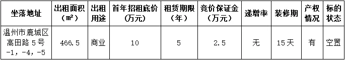 2.竞得人须在成交之日起5个工作日内将首期租金及履约保证金足额缴至温州联合产权交易中心账户(户名:温州联合产权交易中心有限公司,账号:756000120190008655,开户行:温州银行总行营业部);并在规定时间内同出租方签订租赁合同。