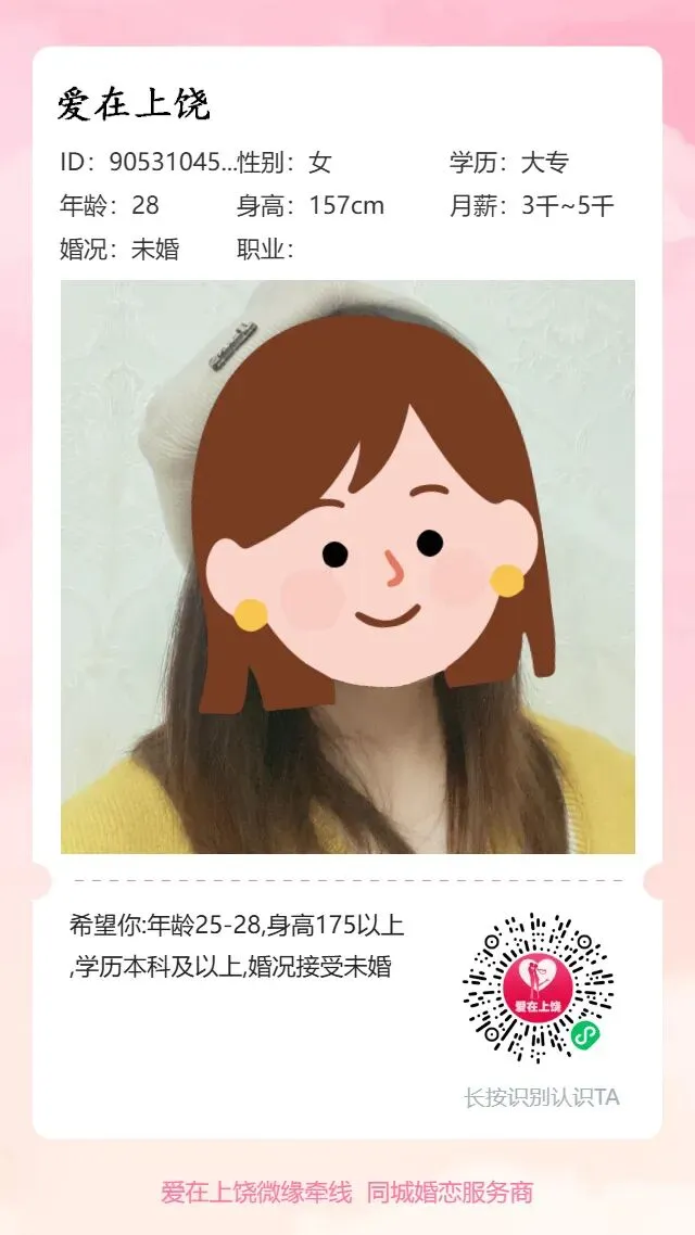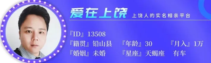 个人情况:铅山人,房车都有,是房地产销售,年收10W左右,不抽烟不喝酒,喜欢旅游。老家还有自建房,姐姐已婚。