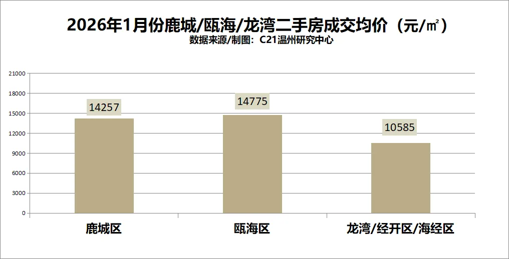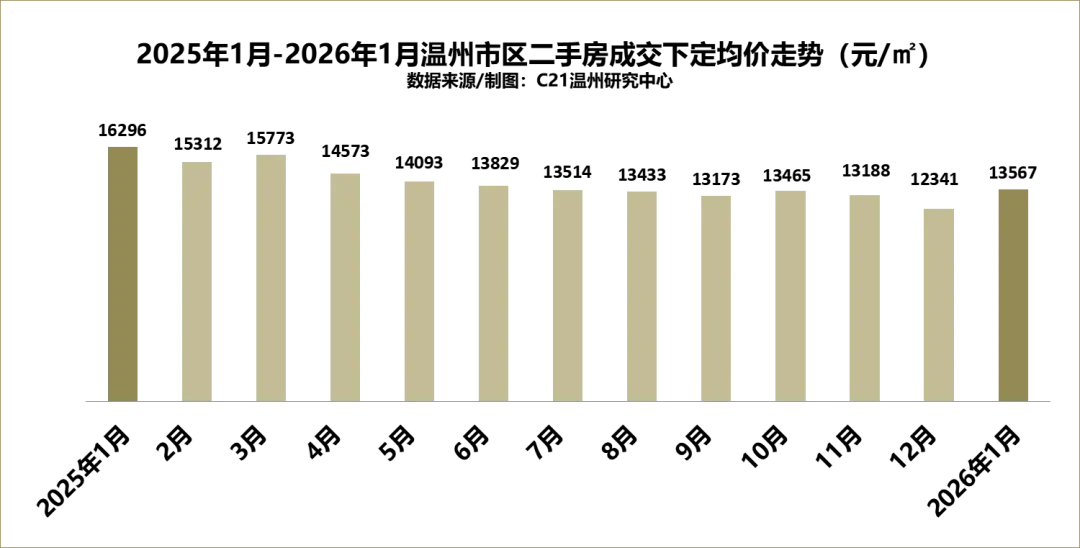 来自21世纪不动产温州区域成交数据显示:2026年1月,温州市区二手房整体成交均价为13567元/㎡,环比上升9.93%。