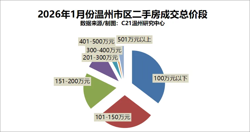 1月,市区二手房(住宅)成交热门总价段排名前三分别为100万元及以下;101-150万元;151-200万元房源。