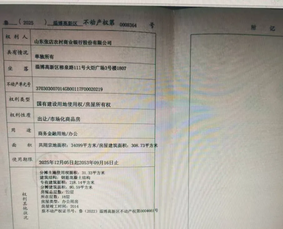 拍卖标的:淄博市高新区柳泉路111号火炬广场3号楼1807的房产,房产面积308.73平方米,用途为办公,参考价:87万元,保证金:20万元。