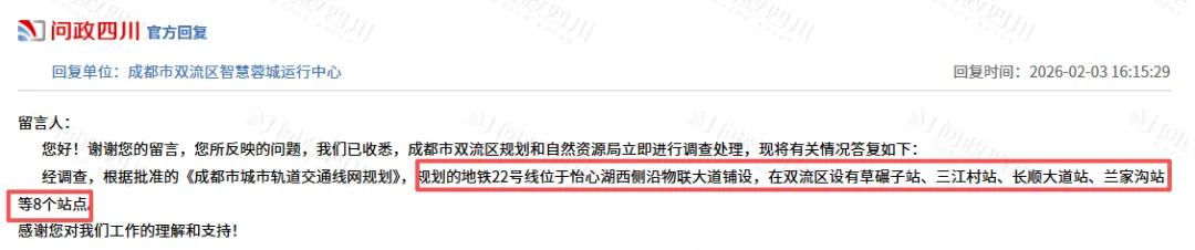 近期,双流区规自局就网友关于成都地铁22号线相关咨询进行了回复: