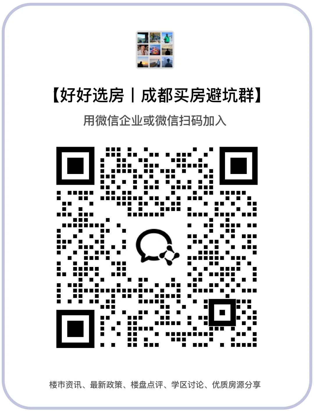 群里会分享楼市资讯、最新政策、楼盘点评、学区讨论、优质房源分享等各类房产信息