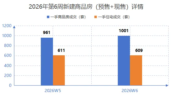 据深圳市房地产信息平台数据,2026年第6周全市新房(预售+现售)成交1,001套,环比增长4.2%。其中商办类产品成交392套,环比增长12.0%。