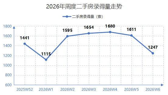 据深圳市房地产中介协会统计,2026年第6周全市二手房(含自助成交)共计录得1,247套,环比下降22.6%。受春节假期临近、人员提前返乡影响,二手房市场热度进入阶段性调整。