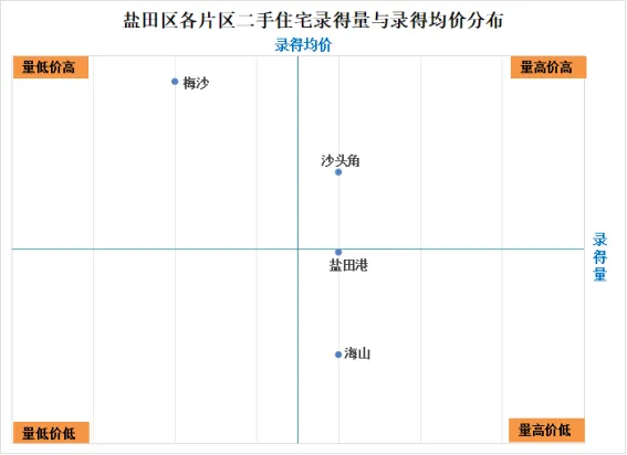 基于2026年第6周盐田区“二手住宅买卖”录得合同数据,选取二手住宅录得量及录得均价两项核心指标,通过均值偏离度分析绘制了片区价值四象限图。该图可直观反映各片区交易活跃度与价格水平相对于盐田区整体均值的偏离程度,为初步评估片区价值提供了可视化依据。