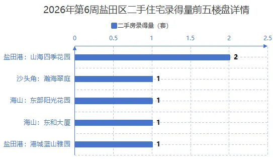 本周盐田区盐田港片区的山海四季花园以2套录得量居榜首。具体如下:
