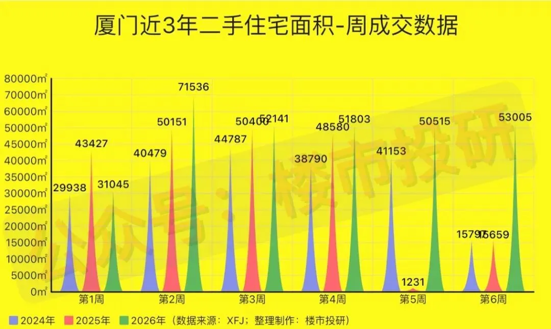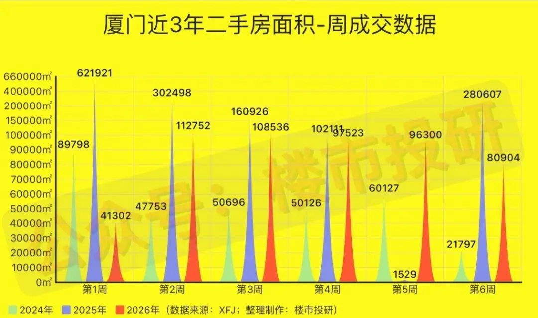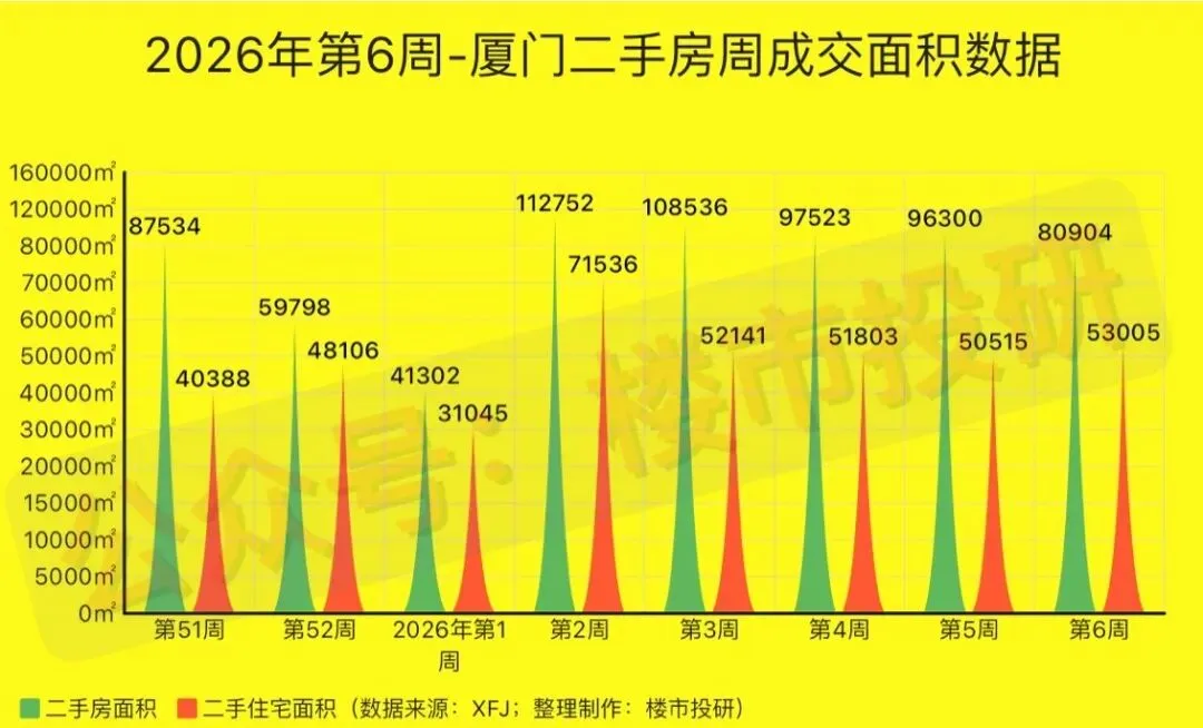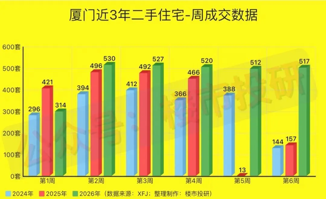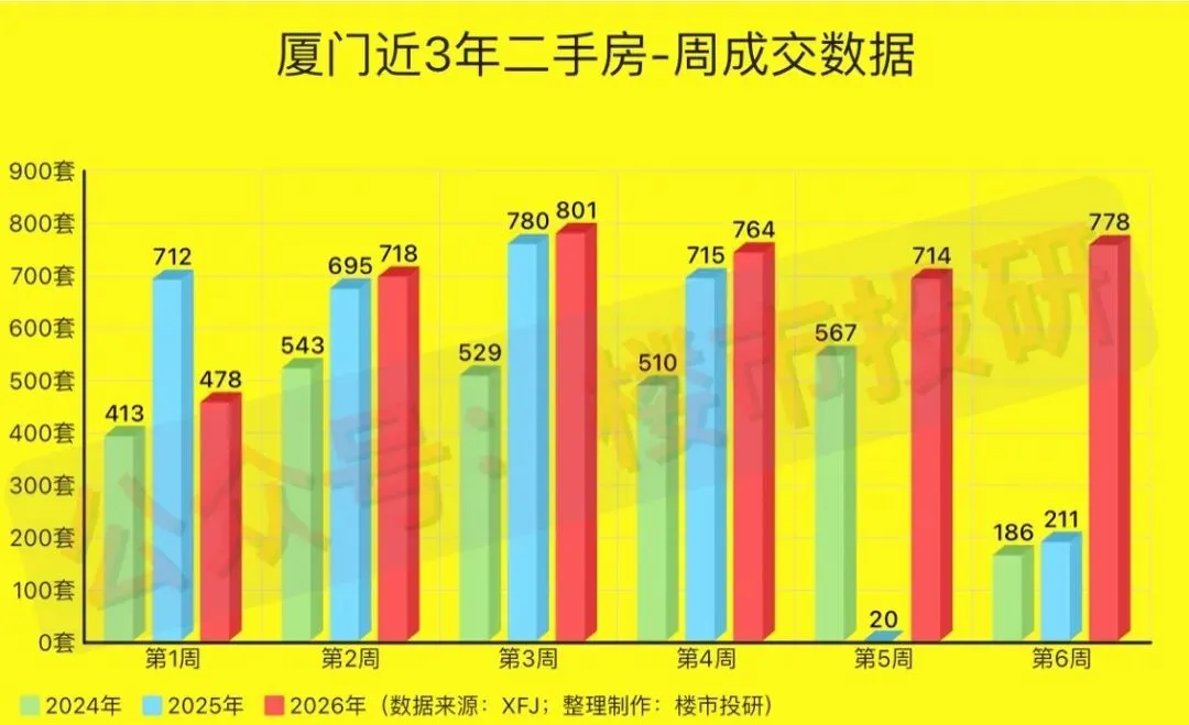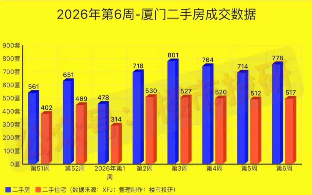 2026年第6周(2月02日-2月08日),厦门二手房累计成交778套(日均成交约111套),环比上涨约8.96%,同比去年上涨约268.72%;其中,二手住宅成交517套(日均成交约74套),环比上涨约0.98%,同比去年上涨约229.30%!