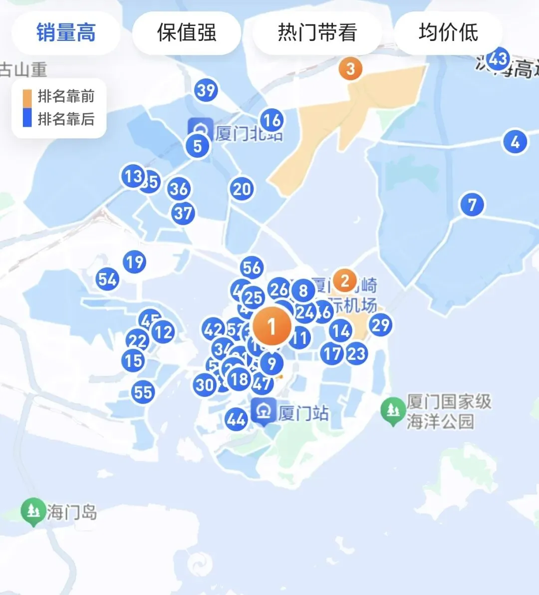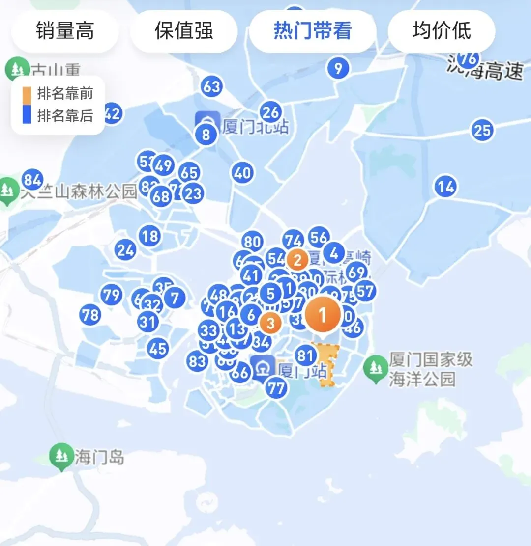 (2)厦门“近7日热门带看”前三版块分别是:第一,瑞景(149人);第二,枋湖(149人);第三,火车站(145人)。