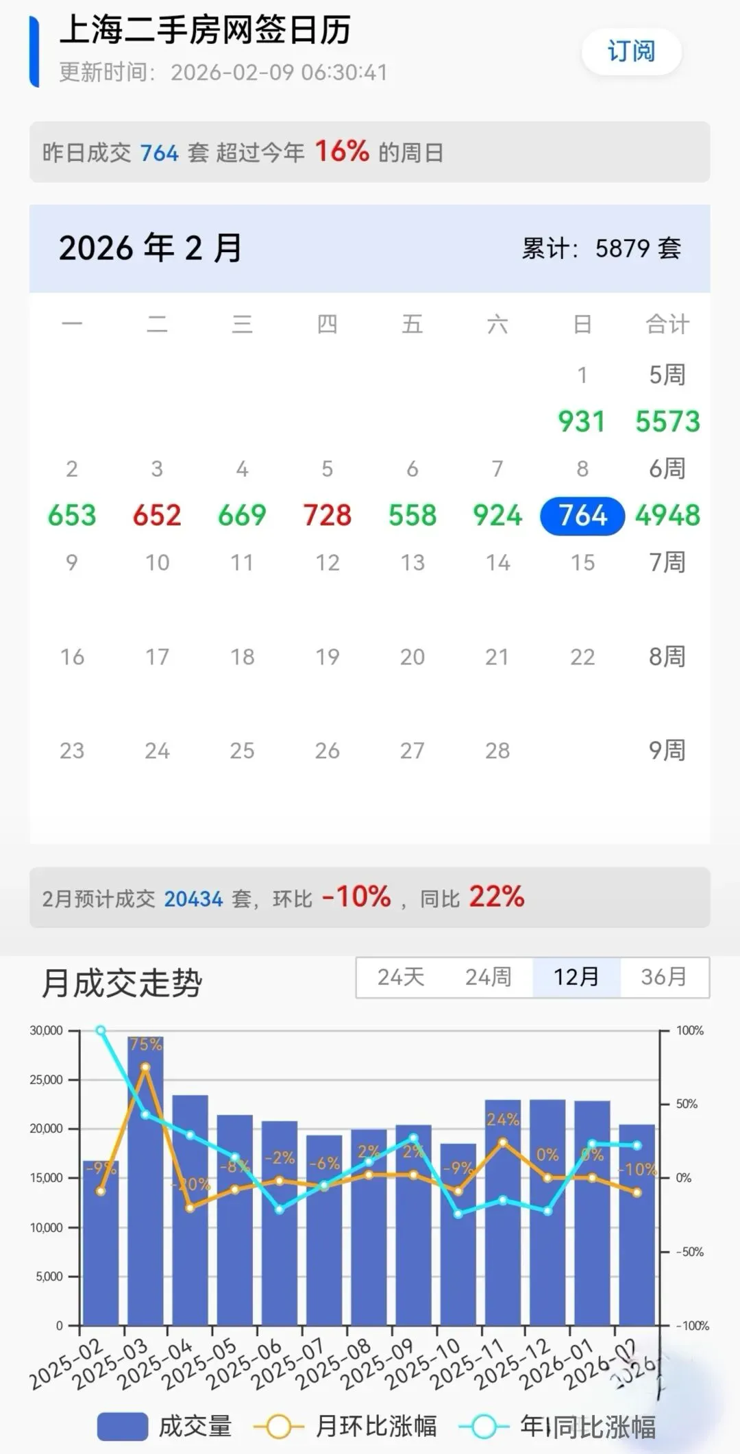 据网上房地产数据统计,2026年2/2-2/8日上海二手房成交量为4948套,周单日最高成交出现在2月7日(周六),达924套。周成交量环比减少11.21%。截至2月8日,上海本月二手房累计成交5879套,日均成交约735套,本周同比上周减少了625套。