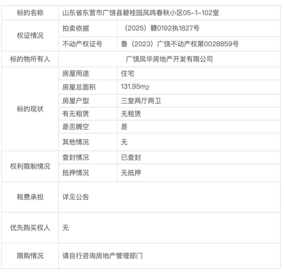 拍卖标的:山东省东营市广饶县碧桂园凤鸣春秋小区05-1-102室房屋,建筑面积:131.95㎡;房地产权证号:鲁(2023)广饶不动产权第0028859号;用途:住宅;总楼层:18层。