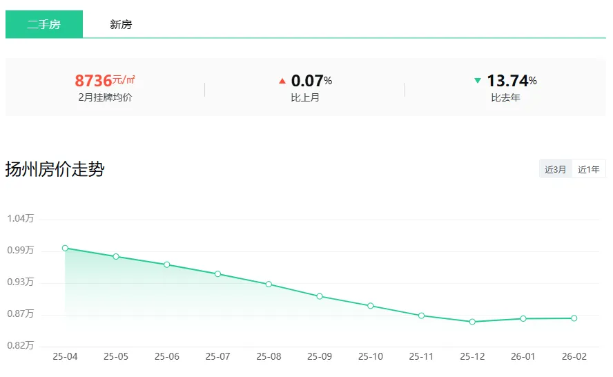 价格方面,根据安居客数据显示:扬州2026年2月二手房均价8736元/m²,环比上月上涨0.07%,同比去年同期下跌13.74%。(数据来源于安居客,仅为二手房挂牌价,房价实时更新,不是成交价,仅供参考。)