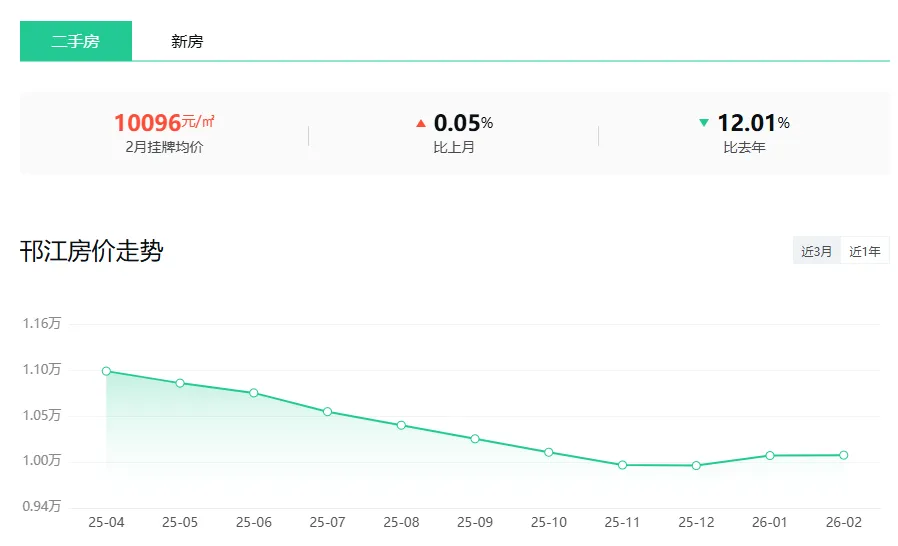 价格方面,根据安居客数据显示:邗江2月二手房均价10096元/m²,环比上月上涨0.05%,同比去年同期下跌12.01%。