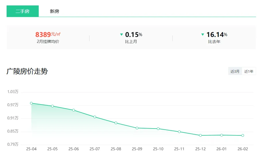 广陵2月二手房均价8389元/m²,环比上月下跌0.15%,同比去年同期下跌16.14%。
