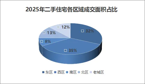 从二手住宅各区域成交面积占比可以看出,西区、东区仍然是市区二手住宅成交主力,两区成交面积之和达到全年总成交面积67%,与2024年相比上涨了2个百分点。从具体占比情况来看,西区占总成交面积35%,占比较2024年下降3个百分点,东区占总成交面积32%,占比较2024年上涨5个百分点。其它区域二手住宅成交落后于西区、东区,其中北区排名第三,占比领先老城区1个百分点,分别为13%与12%,南区受制于区域发展与成交体量,占比历年排名末位,仅占总成交面积8%。