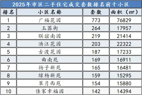 从市区二手住宅成交排行来看,2025年广福花园773套排名第一,面积约7.68万平米;玉器街264套排名第二,面积约1.80万平米;联谊南园219套排名第三,面积约2.14万平米,其它小区排行情况为:
