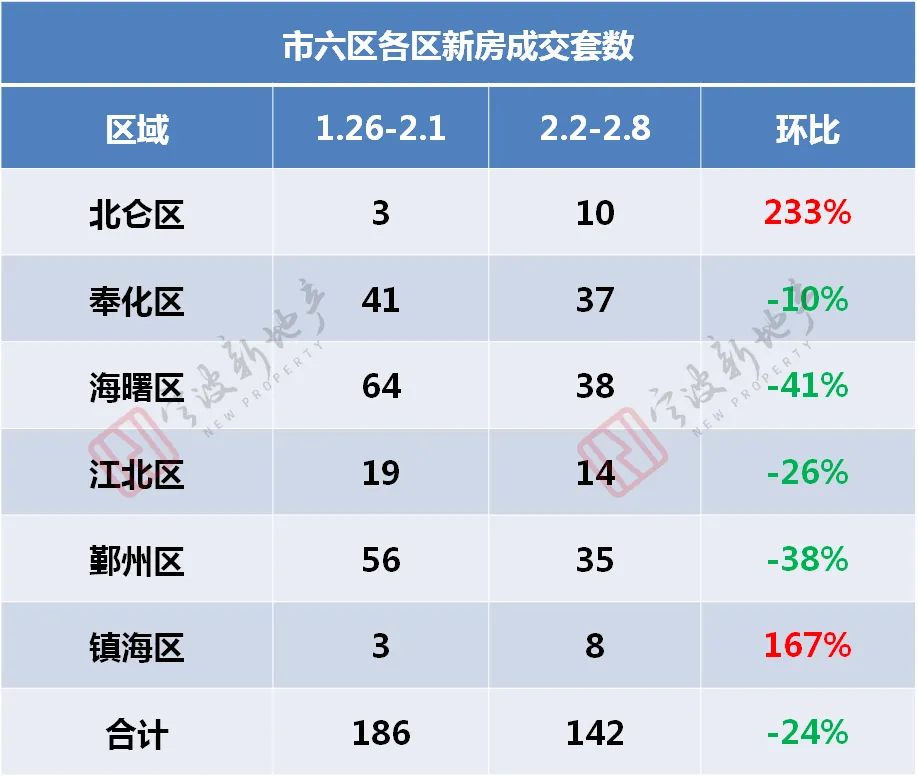 上周(2.2-2.8),宁波新房成交142套,环比下降24%。