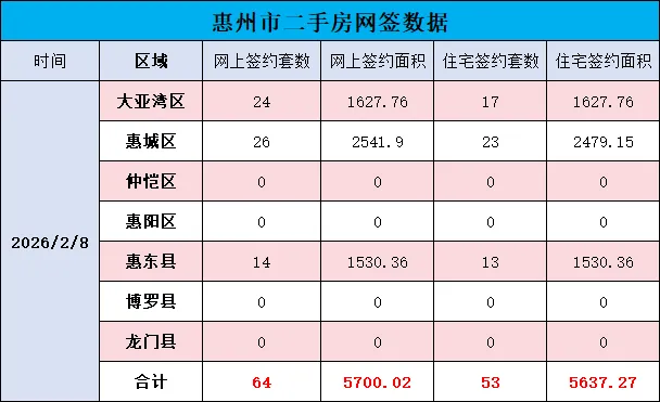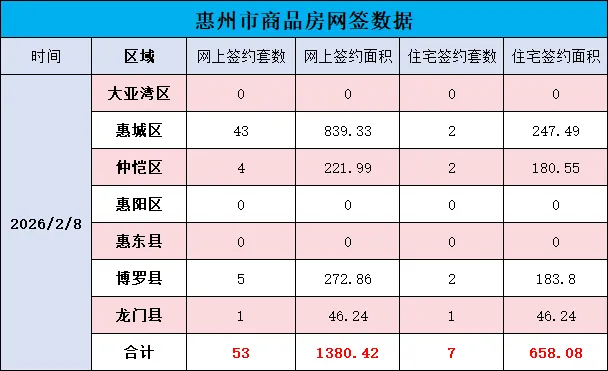 大亚湾区网签0套,面积0㎡;惠城区43套,839.33㎡;仲恺区4套,221.99㎡;惠阳区0套,0㎡;惠东县0套,0㎡;博罗县5套,272.86㎡;龙门县1套,46.24㎡。合计53套,1380.42㎡。